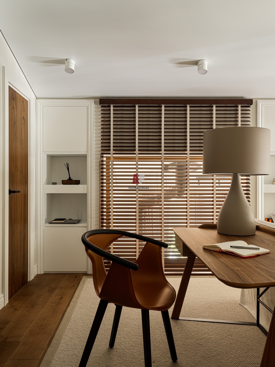 Кабинет. Письменный стол, Bonaldo, модель Scriba. Полукресло, Pedrali, модель Fox. Настольная лампа, Vibia, модель Jazz. Дверь слева ведет в отдельную гардеробную комнату.