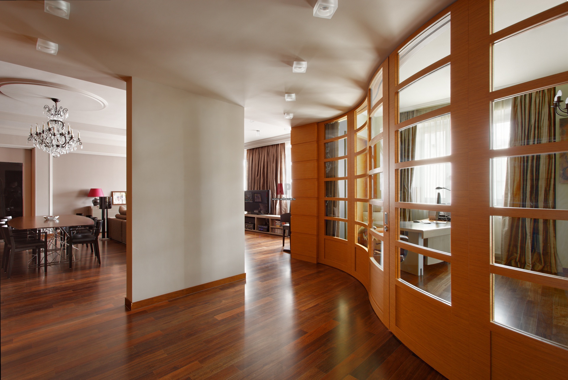 Пластичная стена ведет в центр жилого пространства: объединенную зону гостиной-кухни. Вход в нее предваряют два широких проема, которые окружают несущий пилон.