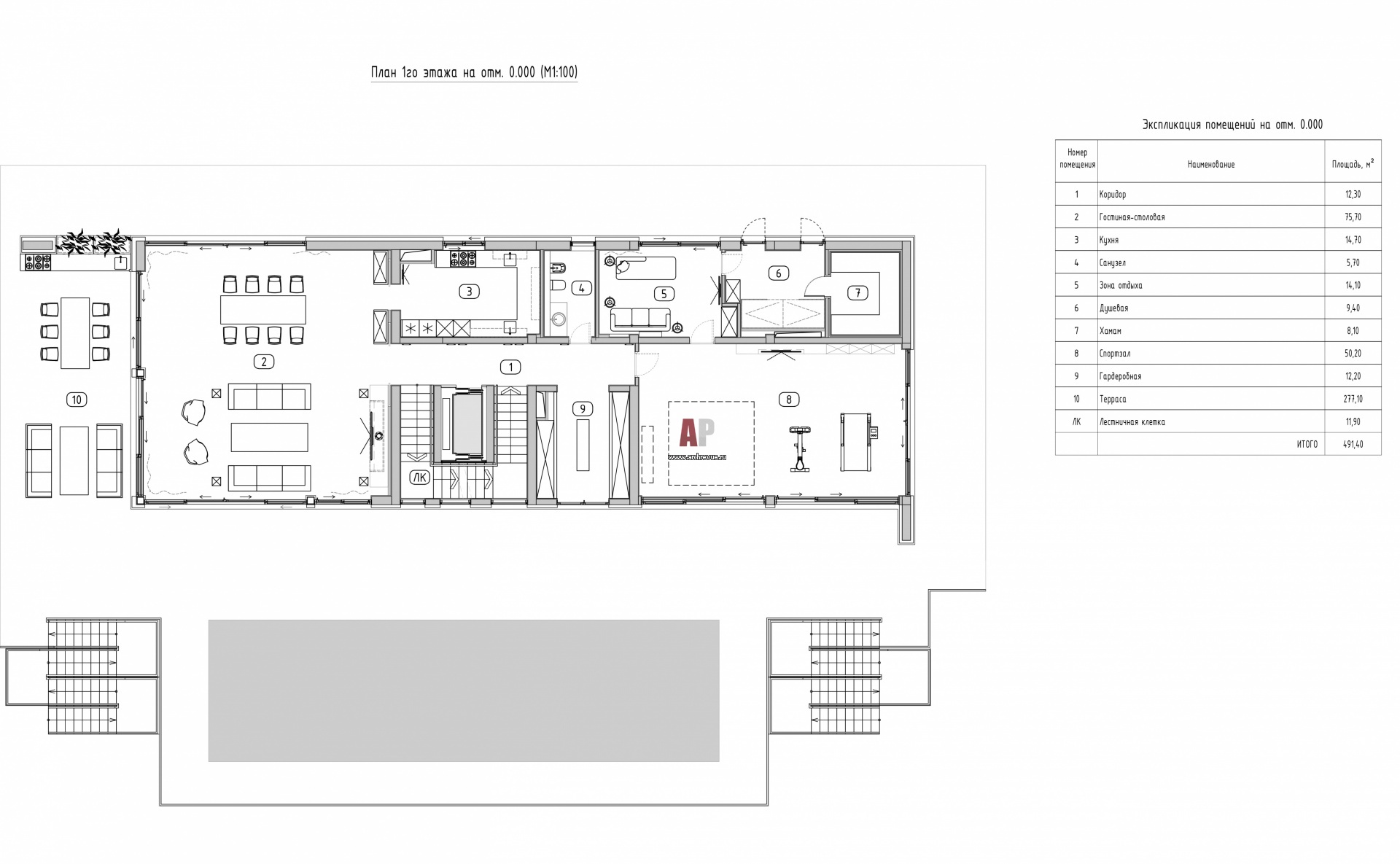 План первого этажа двухэтажного современного дома на Черном море. Общая площадь – 700 кв. м.