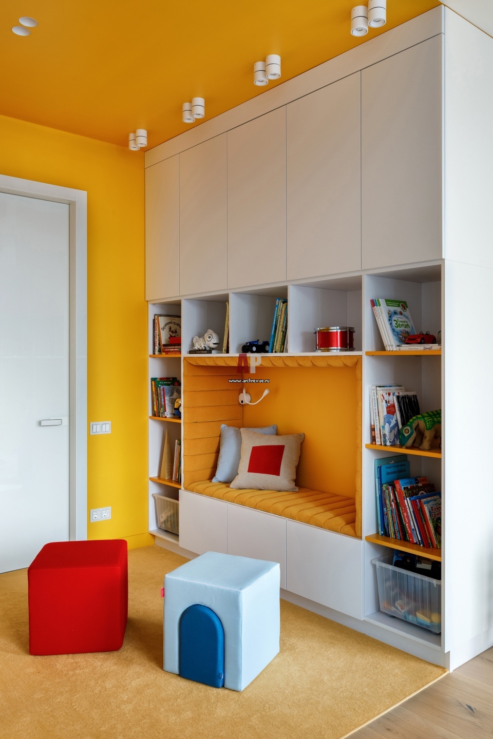 Вход в детскую выделен насыщенным цветом. Потолок, стены, обивка встроенного дивана исполнены в цвете яичного желтка. Встроенная мебель, Schmidt.