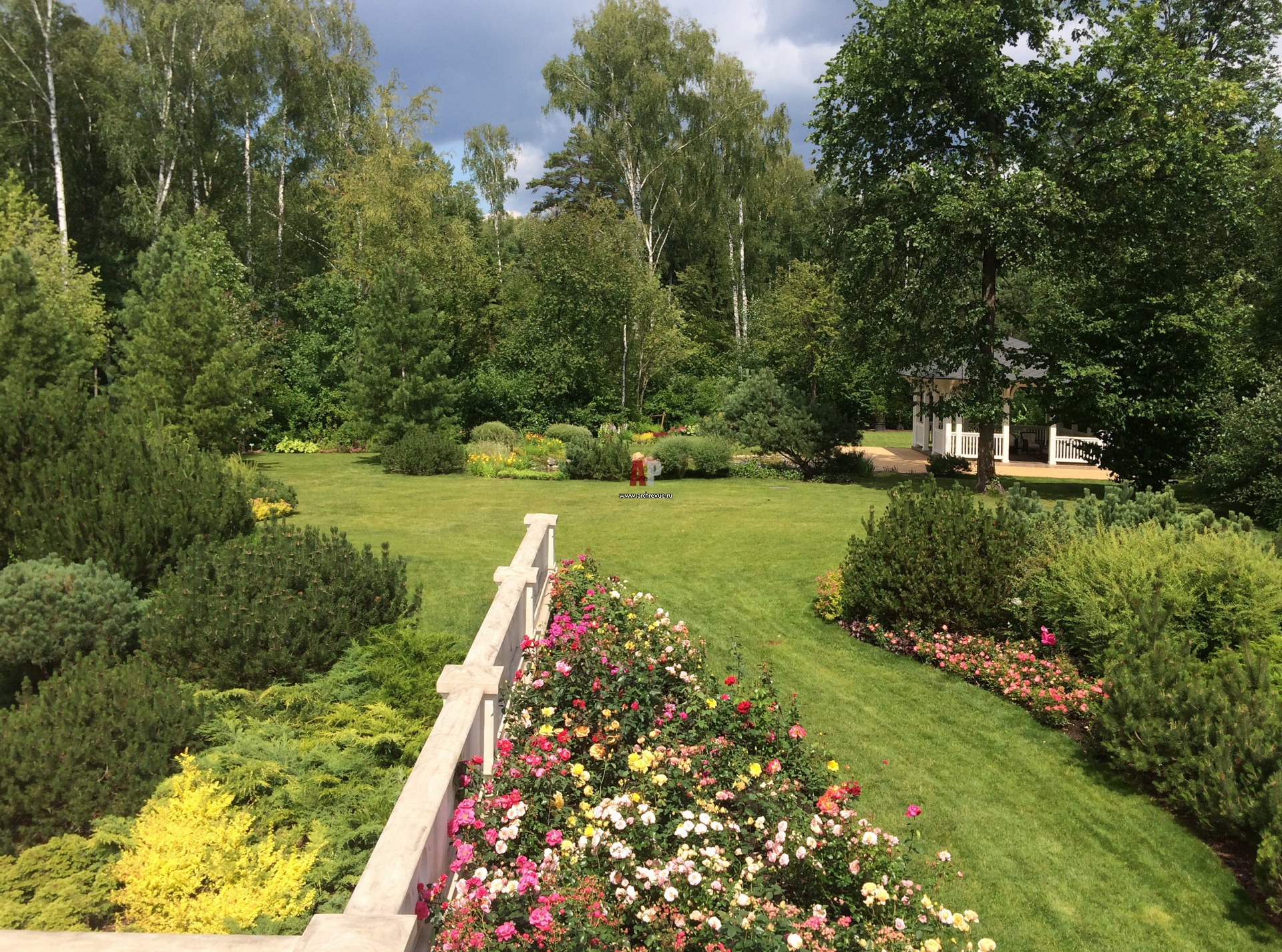 Декоративный приватный сад за домом примыкает к патио, на которое можно попасть из гостиной, кухни, жилых помещений и бассейна. С патио открывается вид на розарий, беседку с водоемом, а также кедровую рощу.