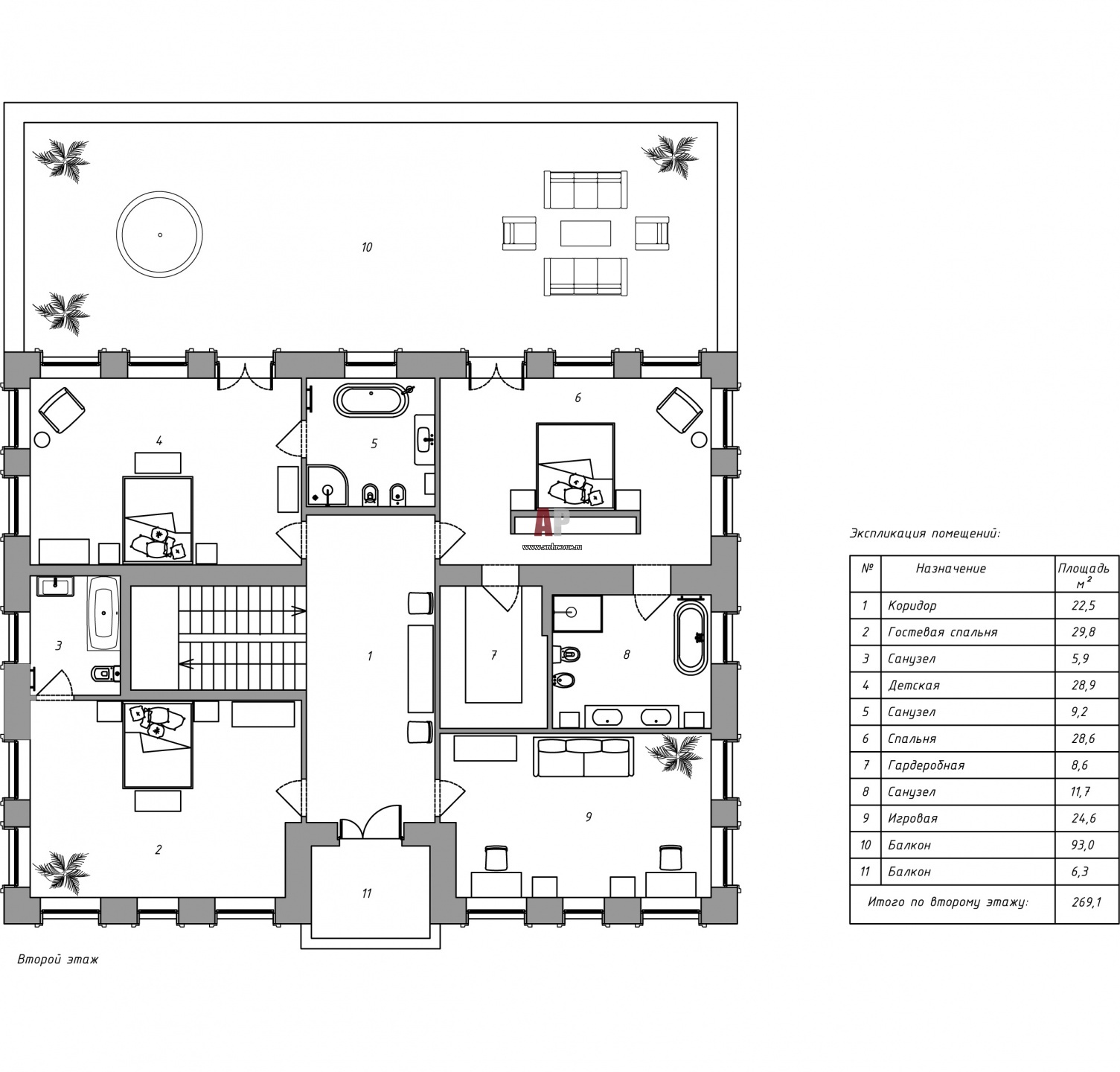 Планировка 2 этажа 2-х этажного дома с эксплуатируемым цоколем площадью 600 кв. м.