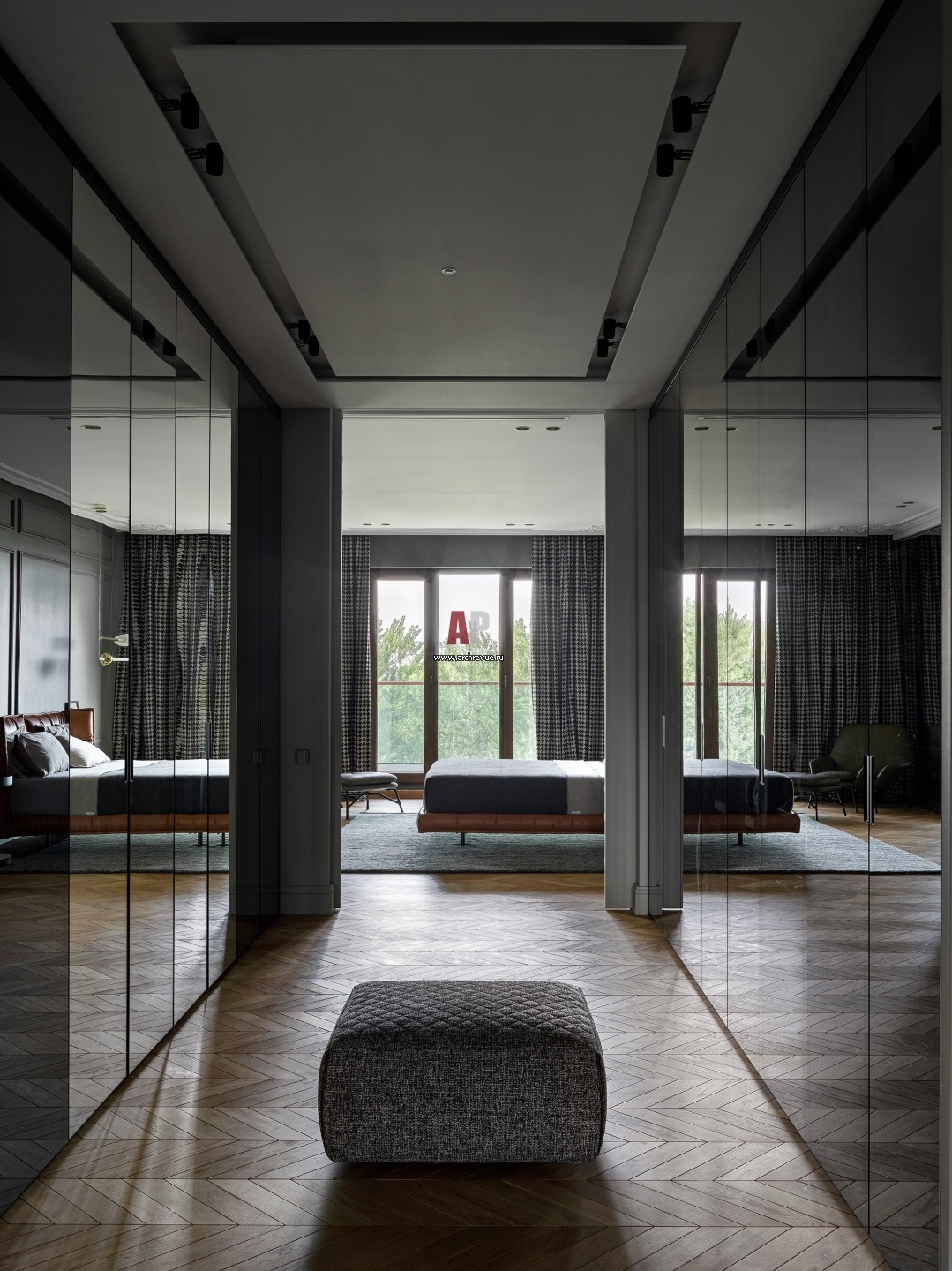 Проходная гардеробная, ведущая в хозяйскую спальню. Зеркальные фасады и наполнение гардеробной, Rimadesio. Пуф, Minotti.