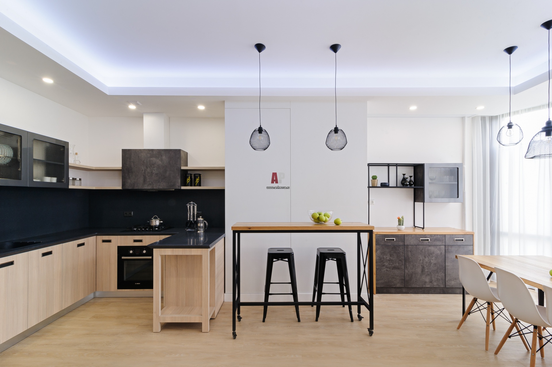 Общая кухня-столовая. Кухонная мебель сделана на заказ по чертежам архитектора. В декоре фасадов комбинируется светлый дуб и панели с имитацией бетона. Столешница из черного камня.