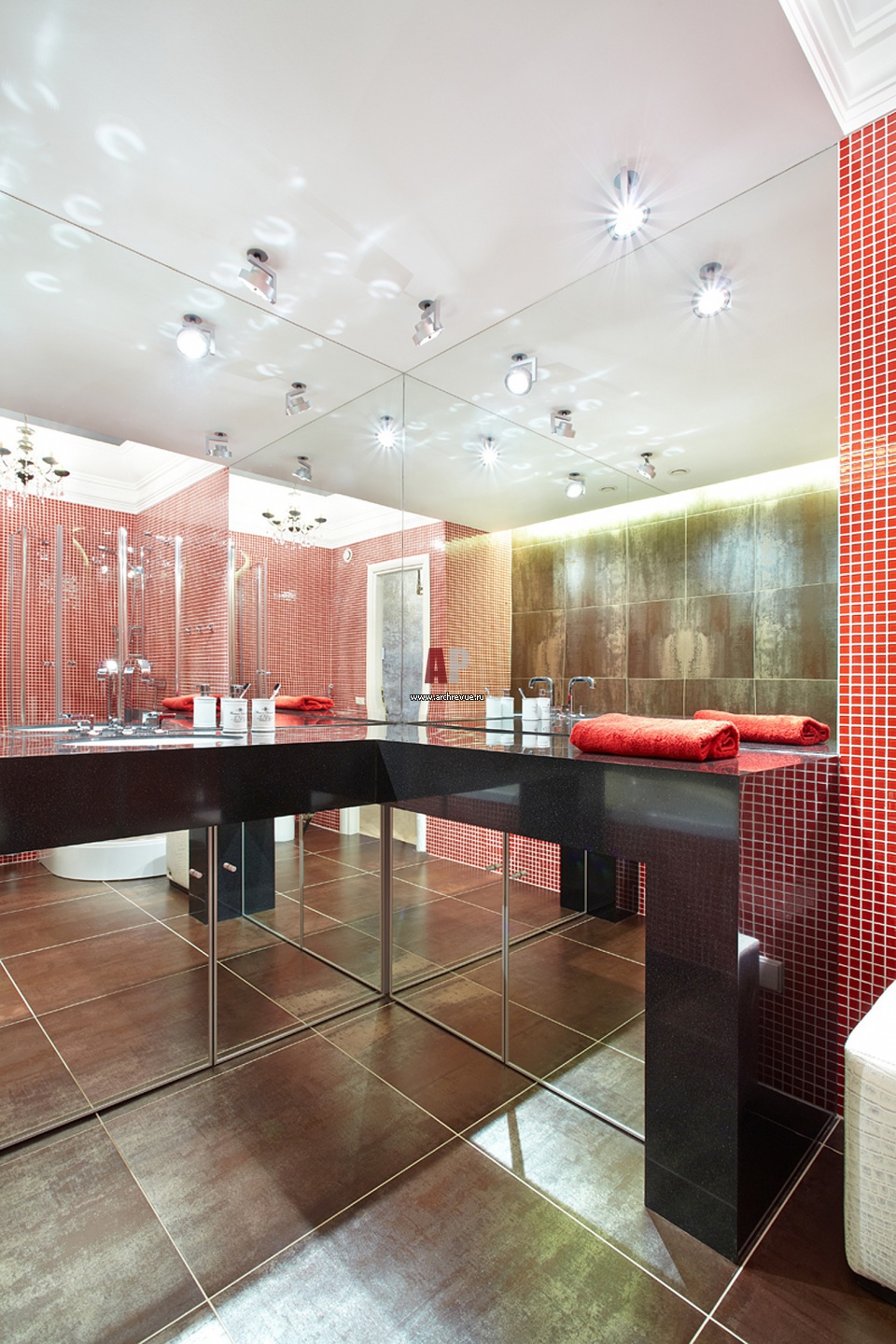 Ванная комната оформлена красной мозаикой и зеркалами. Зеркала использованы в отделке стен над угловой столешницей с встроенным умывальником, а также дверей шкафов. Умывальник, Hatria. Смесители, Hansgrohe.