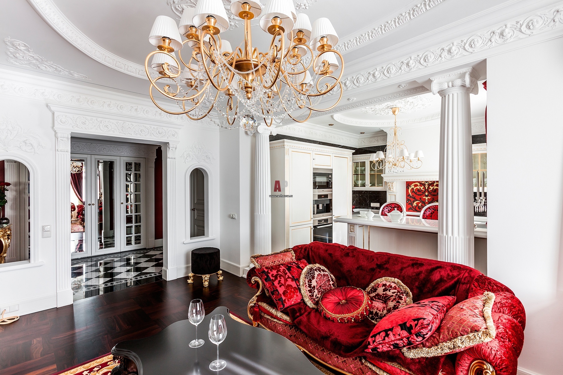 Кухня-гостиная решена по студийному принципу. Интерьер исполнен в красно-белой гамме с черным каменным полом.