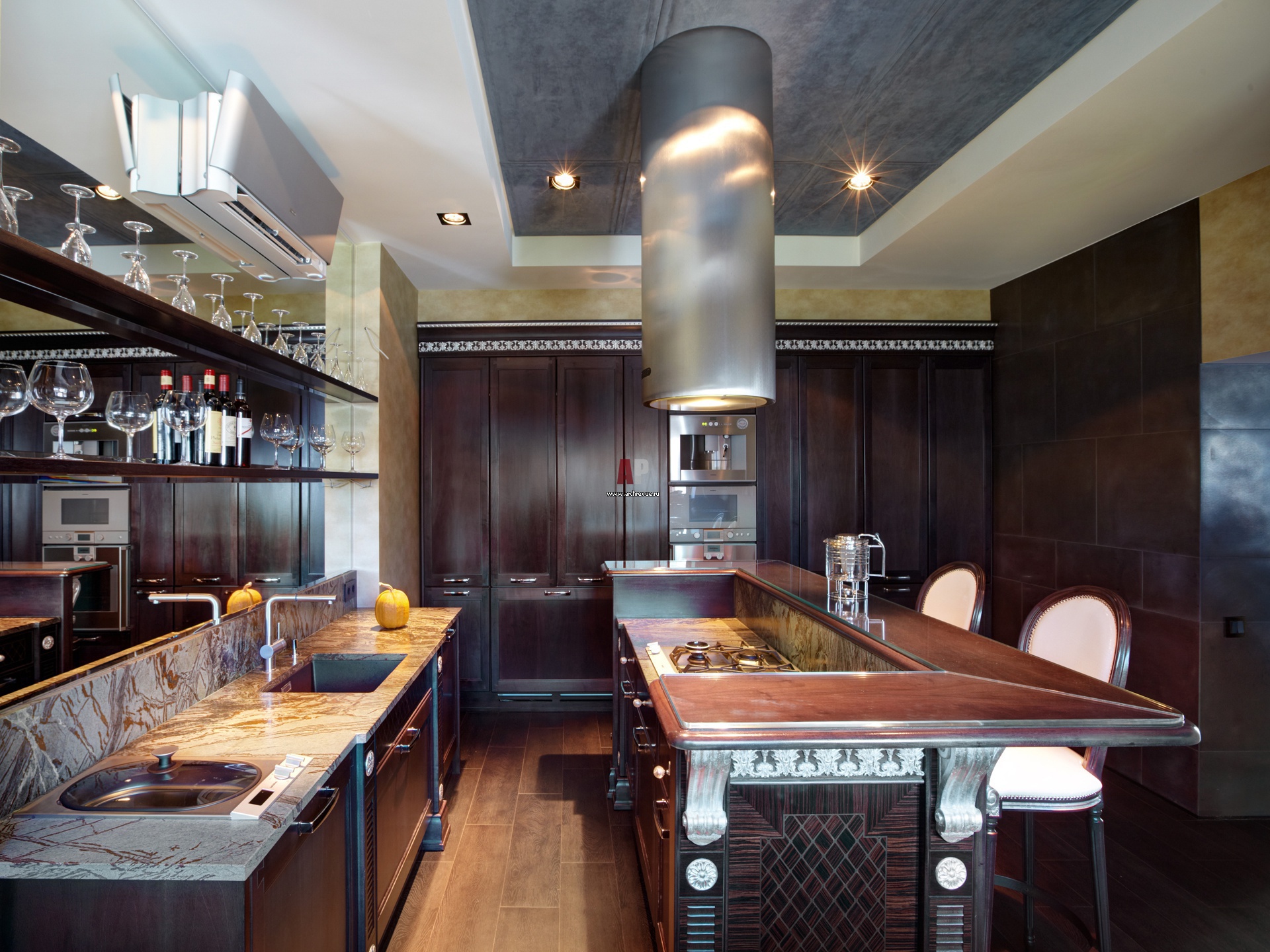 Интерьер кухни выдержан в темной цветовой гамме. Кухонный фартук, столешница кухни выполнены из гранита. Кухонный гарнитур, Arca.