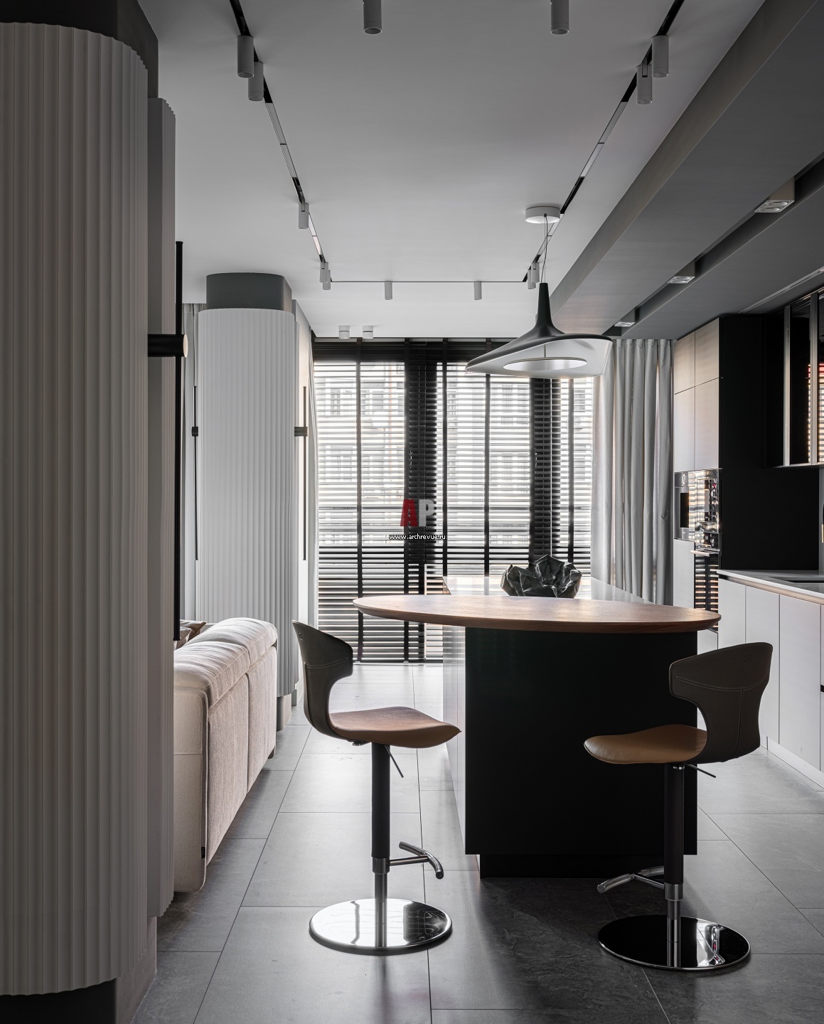 Современный монохромный интерьер квартиры. Кухня с островом. Барный стул, Poltrona Frau.