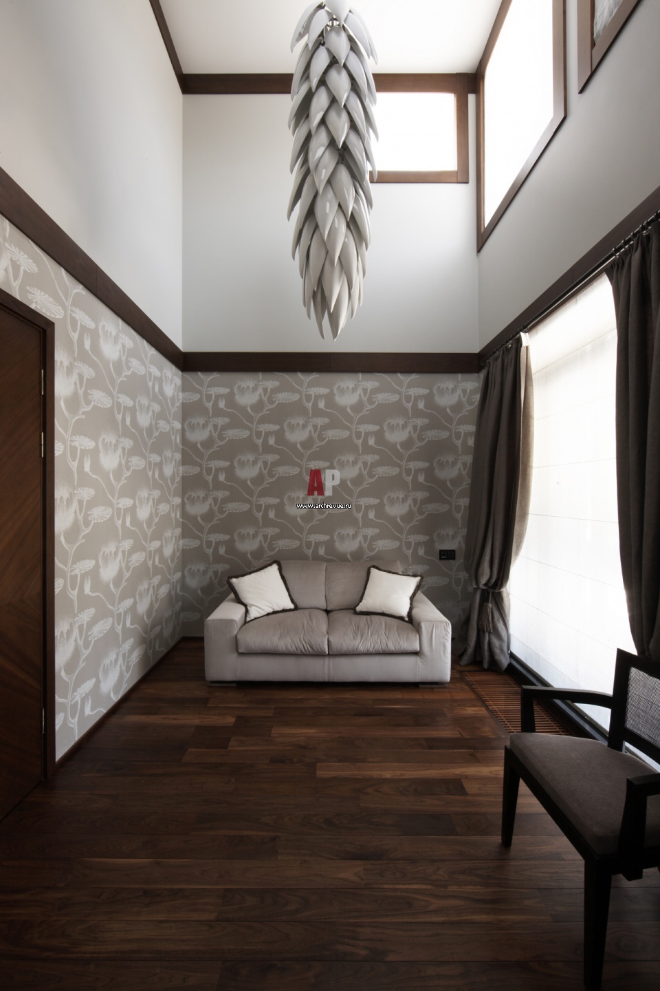 Стены гостевой комнаты до середины оклеены обоями, верх – выкрашен в белый цвет. Этот прием позволил зрительно расширить высокое и узкое пространство. Правильный масштаб помещению сообщает ниспадающий с потолка оригинальный светильник, набранный из керамических «чешуек».