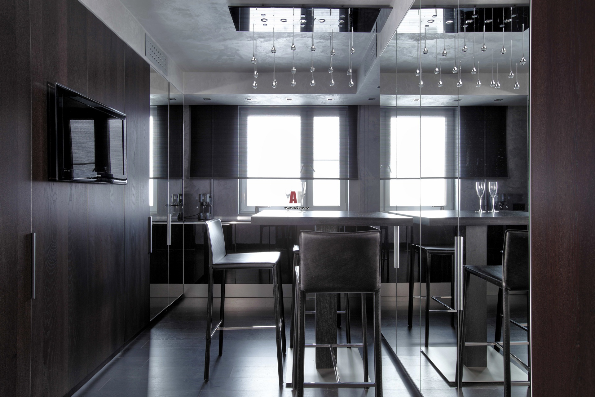 Кухня-столовая – центральное помещение в квартире. Здесь хозяйка готовит, принимает гостей и работает. Вместо навесных шкафов использованы встроенные шкафы и панели из венге, акцентирующие плоскость стен.