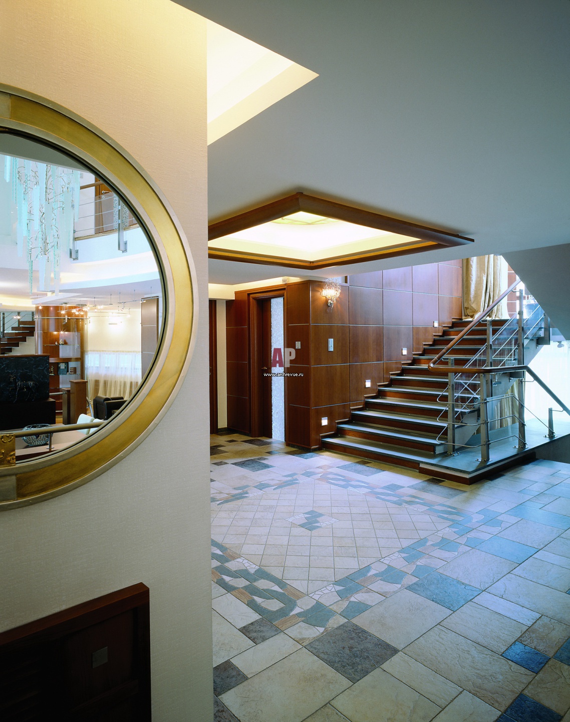 С гранитом огневой обработки, которым облицованы ступени лестницы, гармонируют настенные панели из шпона вишни, изготовление «СТ. Интер».
