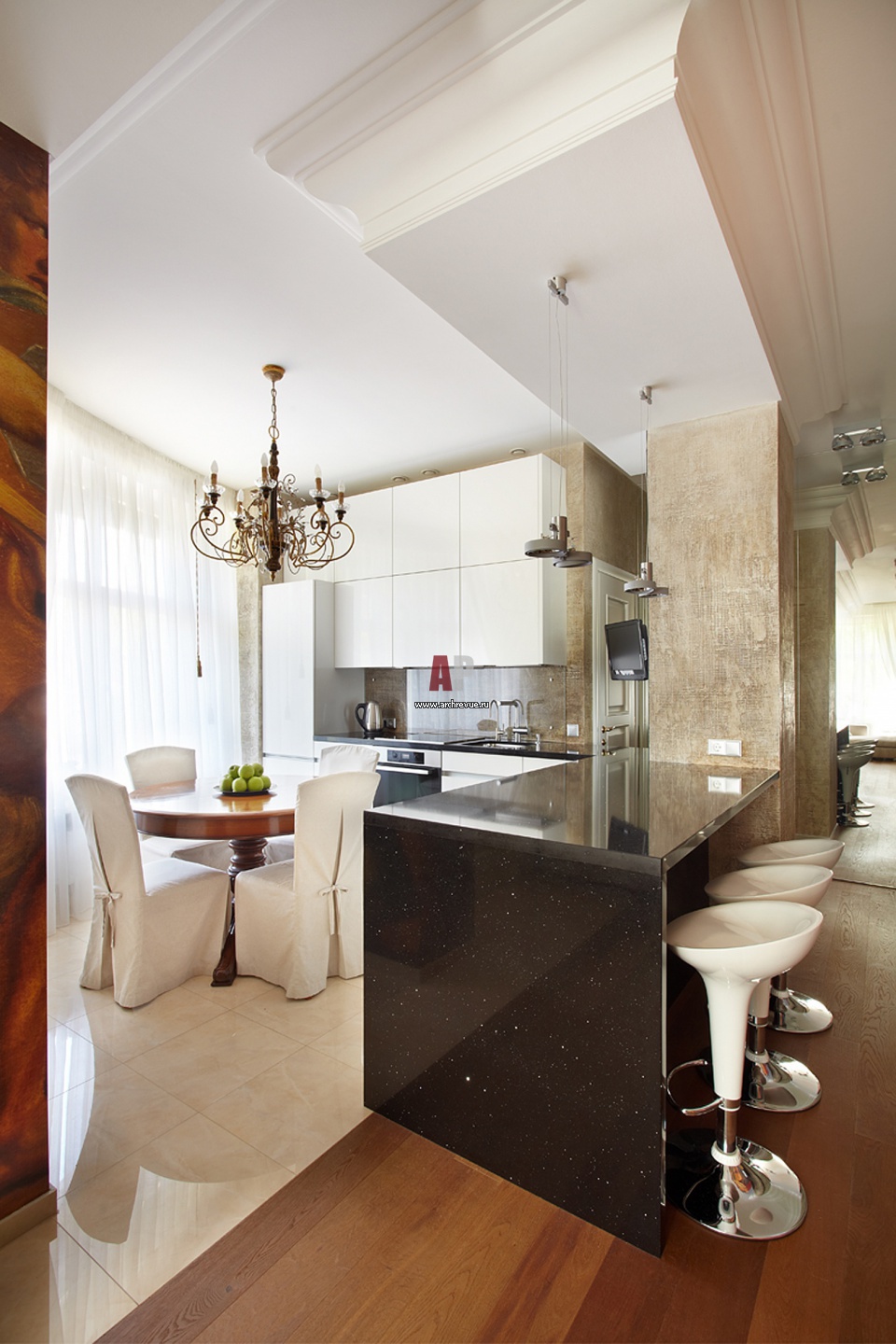 Сложная пластика потолка с широкими классическими лепными карнизами продиктована необходимостью замаскировать оборудование приточно-вытяжной вентиляции. Кухня с закрытыми былыми глянцевыми фасадами, Leicht.