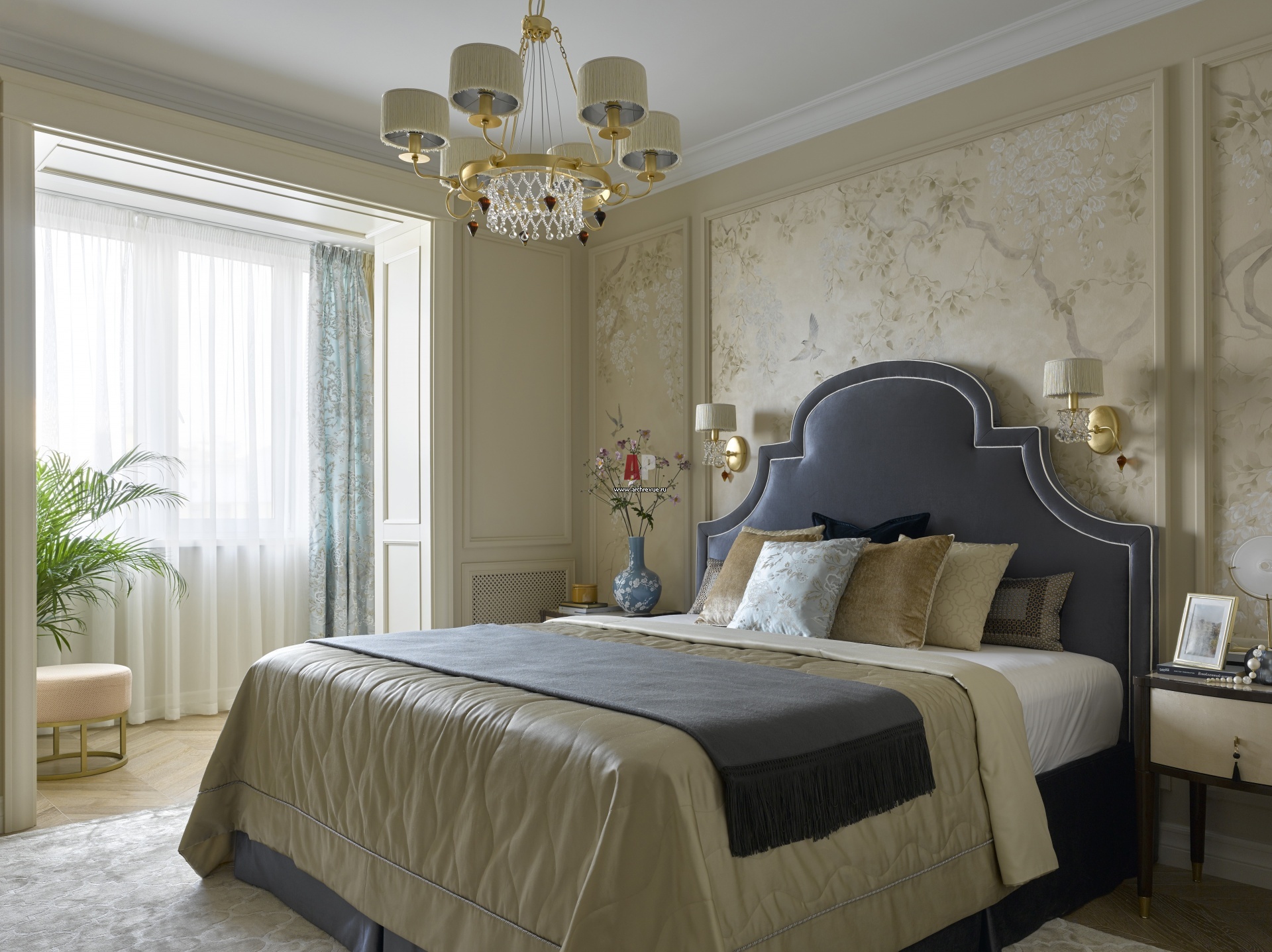 Спальня хозяйки. На стенах обои с ручной росписью, изображающей пышный сад, Fresq. Кровать, Softhouse. Ковер, Serge Lesage.