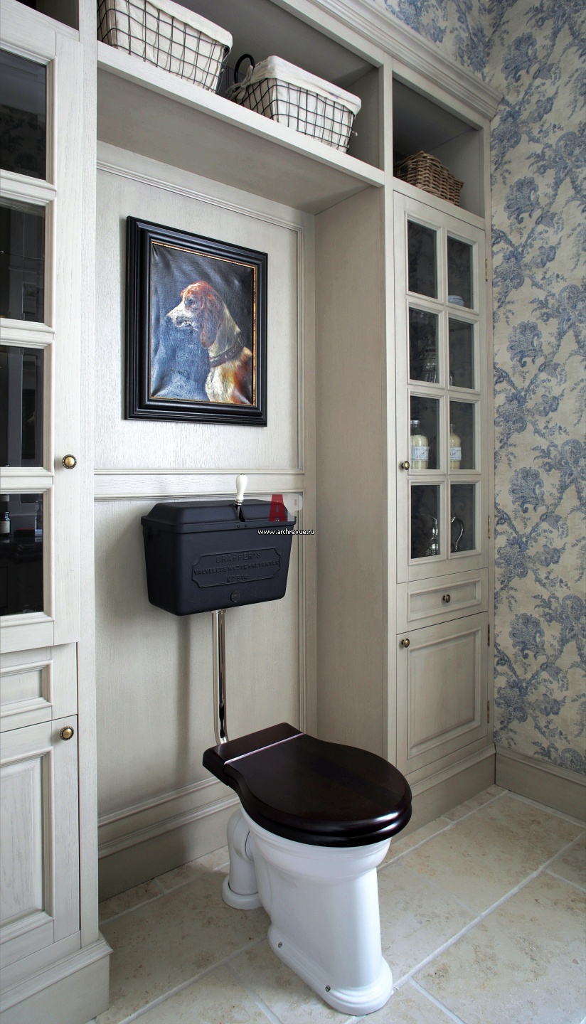 Гостевой санузел на первом этаже. Мебельная композиция выполненна на заказ из светло-серого дерева с темно-серыми вставками. Унитаз Thomas Crapper & Co с черным чугунным бачком и рычагом смыва, как у игрального автомата.