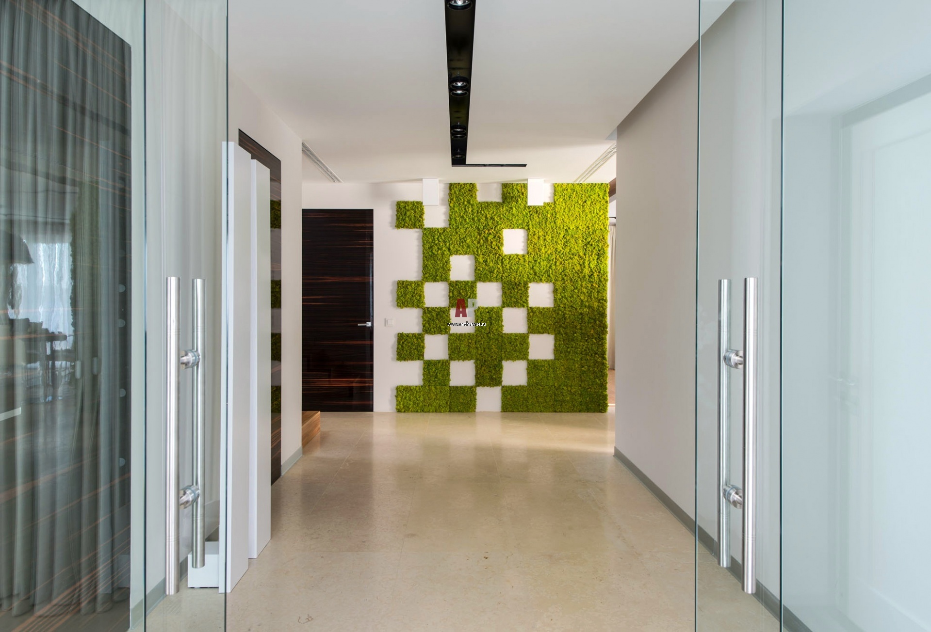Интерьер входной группы. Стены оформлены композициями из стабилизированного мха.