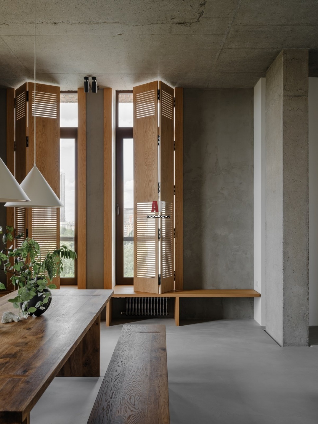Квартира в стиле минимализм с деревянными ставнями. Интерьер столовой.