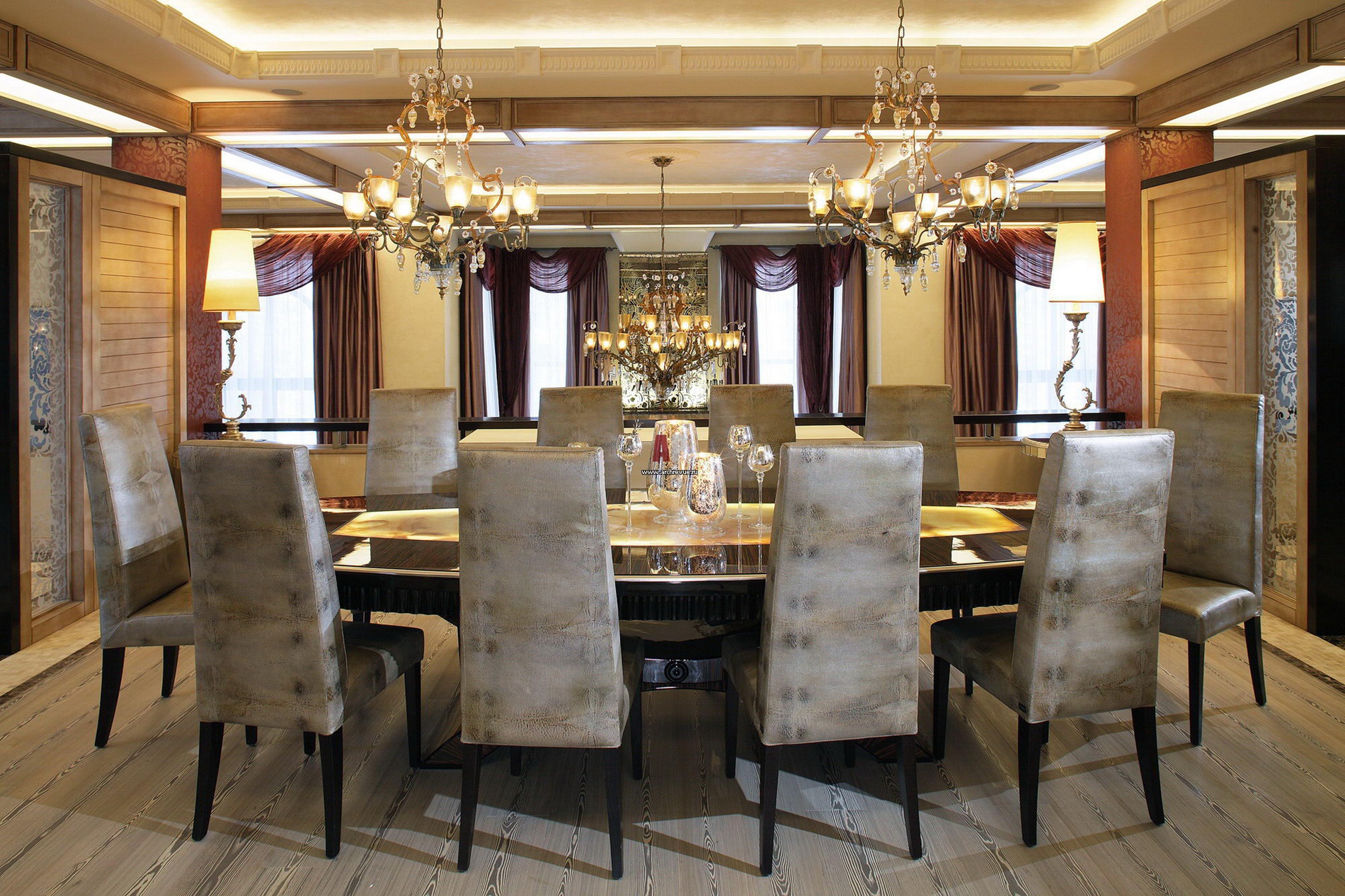 Фрагмент интерьера столовой. Парадная столовая находится на втором этаже. Из нее открывается прекрасный вид на гостиную зону камин и роскошную центральную люстру Gallo. Стол Francesco Molon, стулья Fendi.