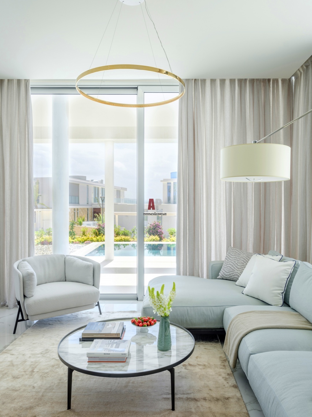 Современная двухэтажная вилла на Кипре. Интерьер малой гостиной в прохладных пастельных цветах. Торшер, Vibia.
