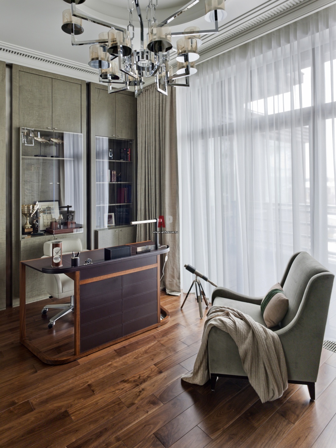 Кабинет хозяина дома в стиле ар-деко. Письменный стол, Giorgetti. Кресло, The Sofa & Chair Company. Встроенные шкафы сделаны по эскизам автора проекта.