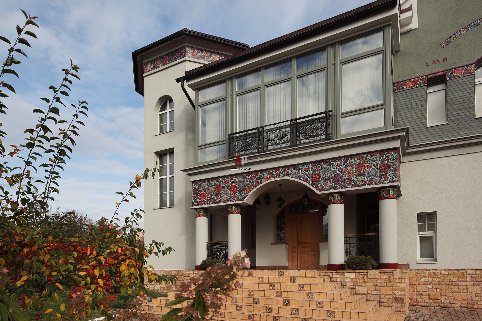 Главный фасад с элементами модерна. Входную группу украшают керамические панно с изображением пионов. Панно выполнены по эскизам автора проекта керамистами студии «Клэймонд».