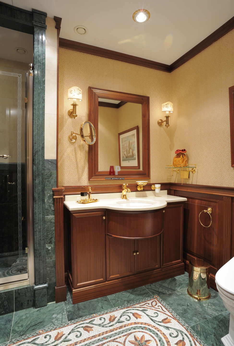 Санузел при хозяйском кабинете выполнен в мужском английском стиле. Пол и пилястры облицованы зеленым мрамором. Низ стен отделан деревянными панелями, верх – текстильные обои с пропиткой от влаги. Умывальник с округлой раковиной, Devon & Devon.