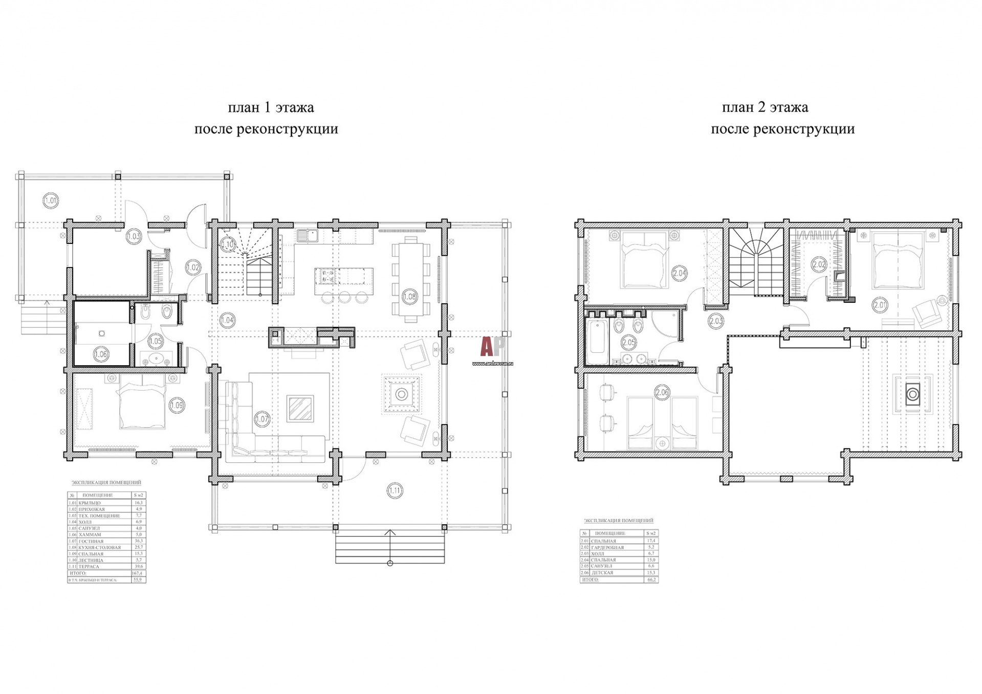 Планировка 1 и 2 этажей деревянного дома после реконструкции. Общая площадь - 234 кв. м. после рекнострукции