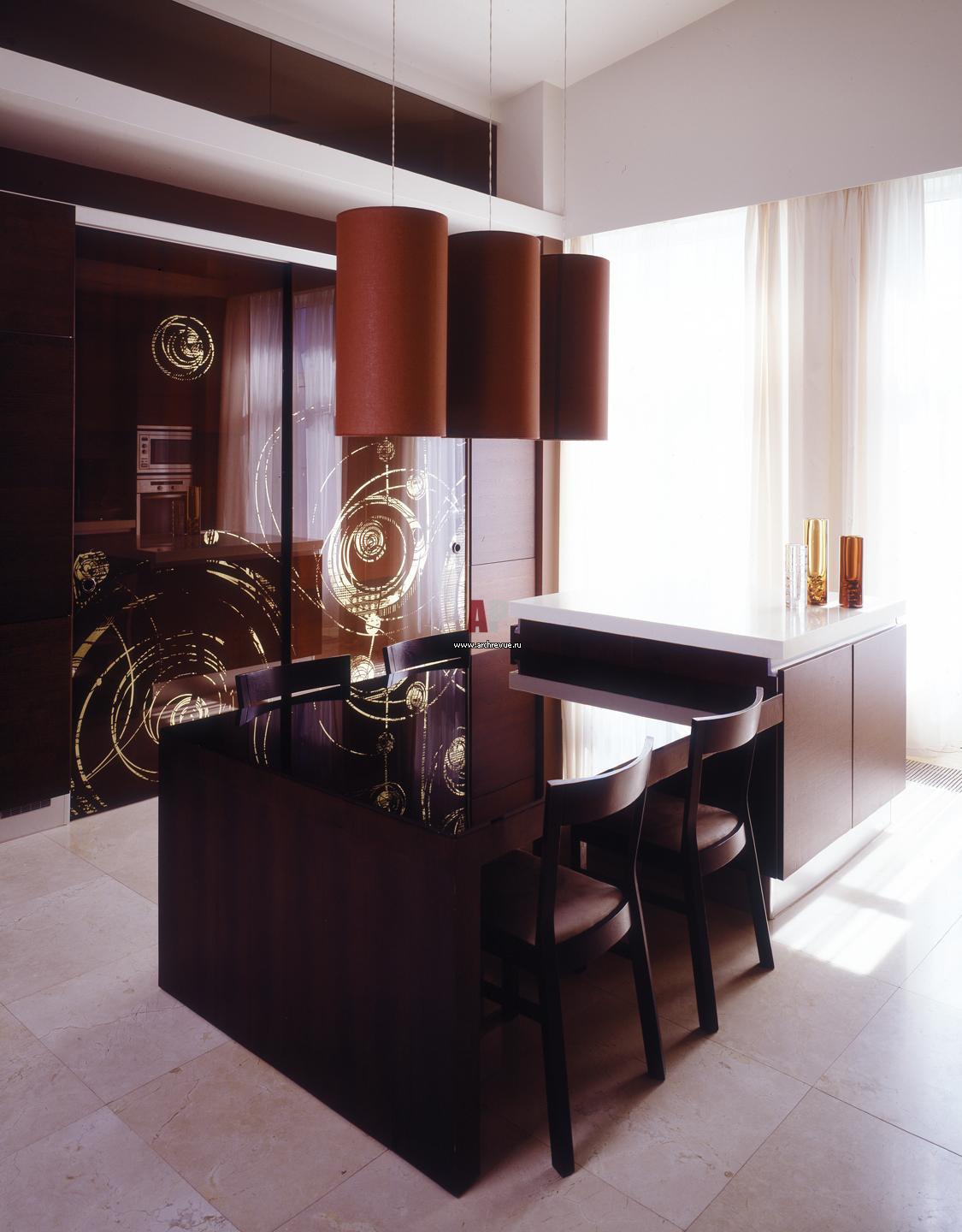 Индивидуальность интерьеру придают стеклянные перегородки с золотым узором, изготовитель Stiv TS и «Московская студия мастерская шелкографии Б. Бельского». Остров на кухне накрыт панелью из бронзового стекла. Из бронзового стекла выполнены дверцы кухонных шкафов.