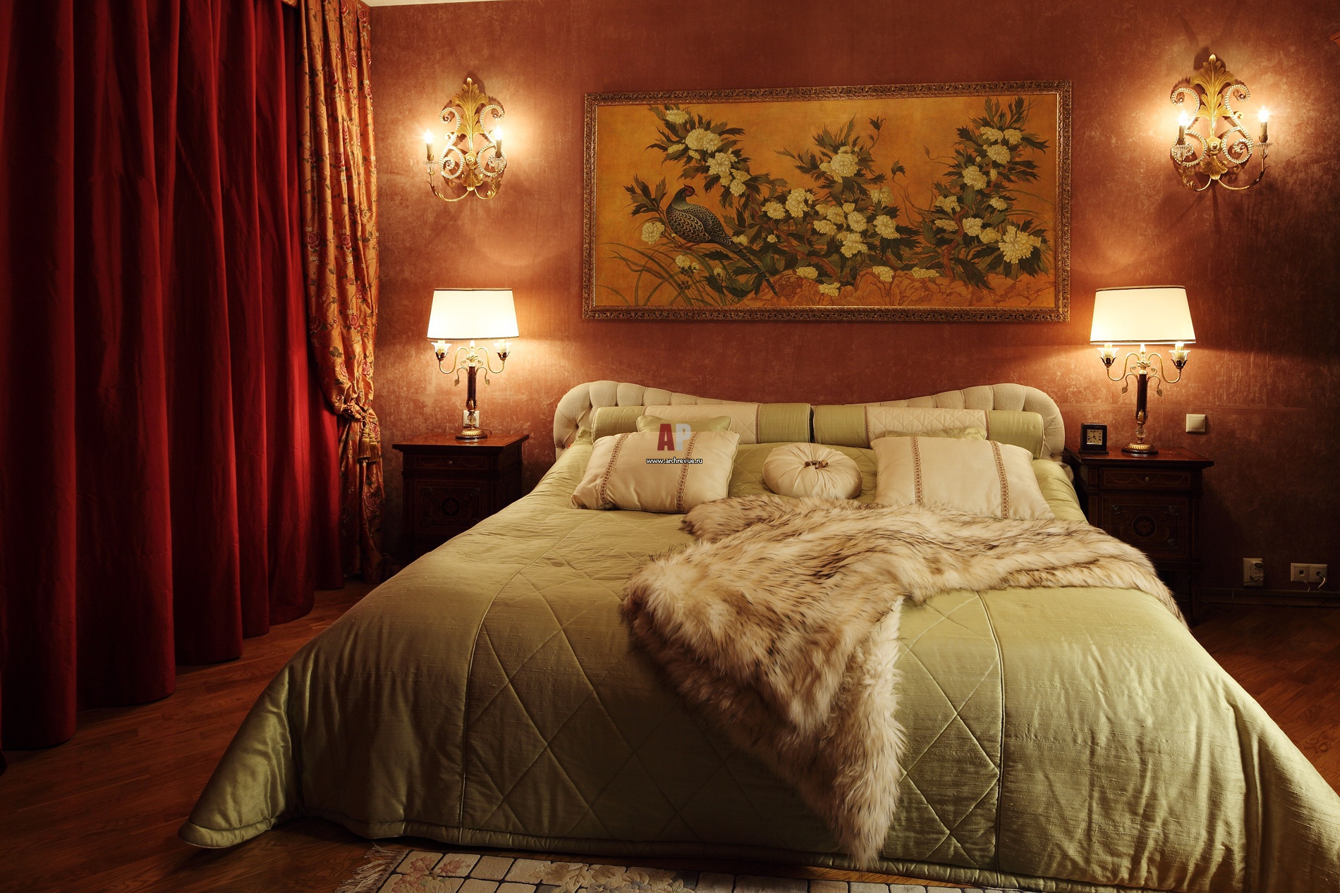 Хозяйская спальня на втором этаже в неоклассике. На стенах – текстильные обои, имитирующие обивку бархатом.