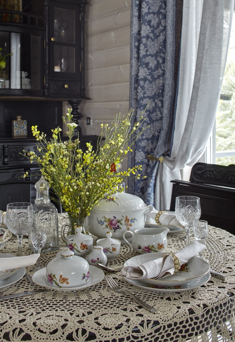 Декор стола летней дачи. На кружевной скатерти – советский сервиз.