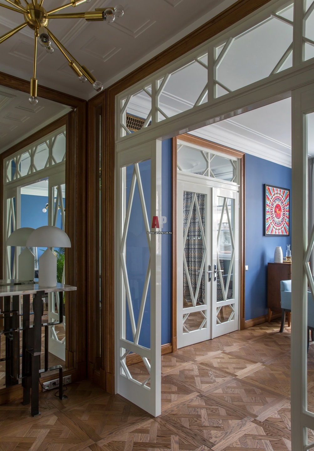 Интерьер холла. Двери с расстекловкой, на заказ. Консоль из металла, на заказ. На ней – настольная лампа, Oluce. Люстра Satellite, винтаж.