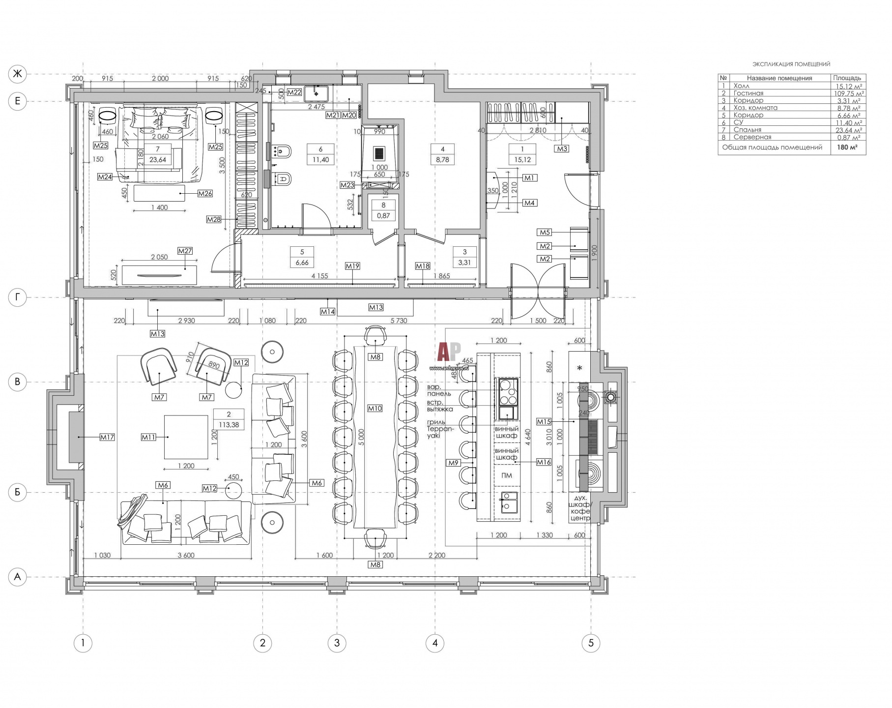 План одноэтажного гостевого дома для ивентов и отдыха. Общая площадь – 188 кв. м.
