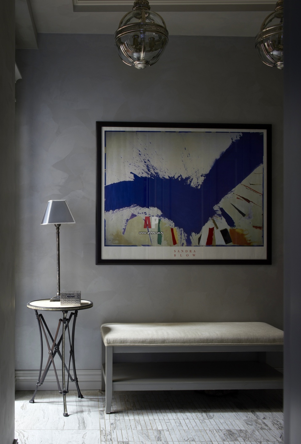 Прихожей в квартире раньше не было, дизайнер выделила небольшой входной блок. Стены в нем оформила в едином стиле с гостиной (декоративной штукатуркой с эффектом мокрого шелка). На полу – серый керамогранит с разным видом укладки. Столик и банкетка, Mis en Demeure. Светильники, Eichholtz.