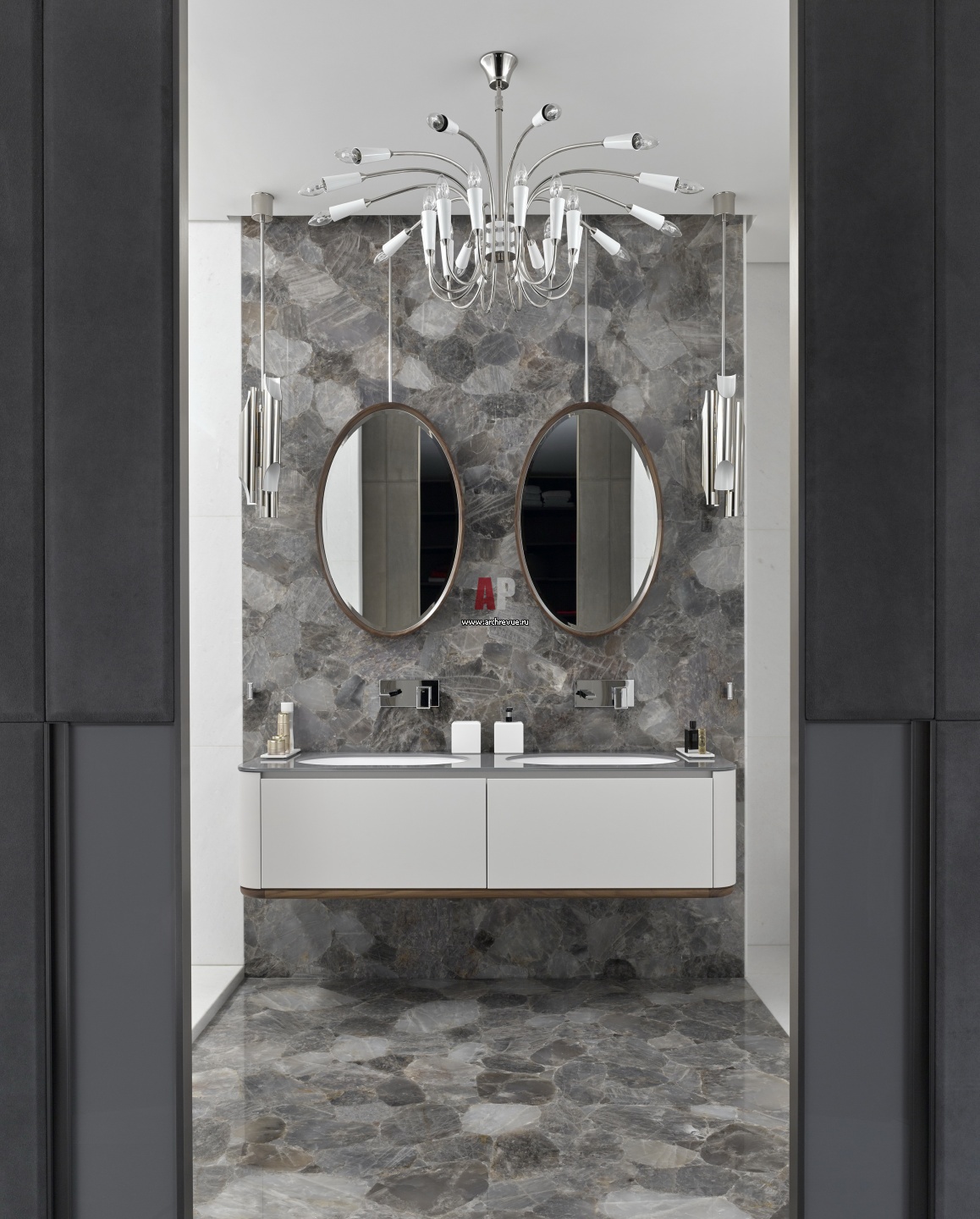 Интерьер хозяйской ванной комнаты. Стены и пол облицованы слэбами из агата. Двери Longhi, модель Ianus. Мебель, Antonio Lupi.