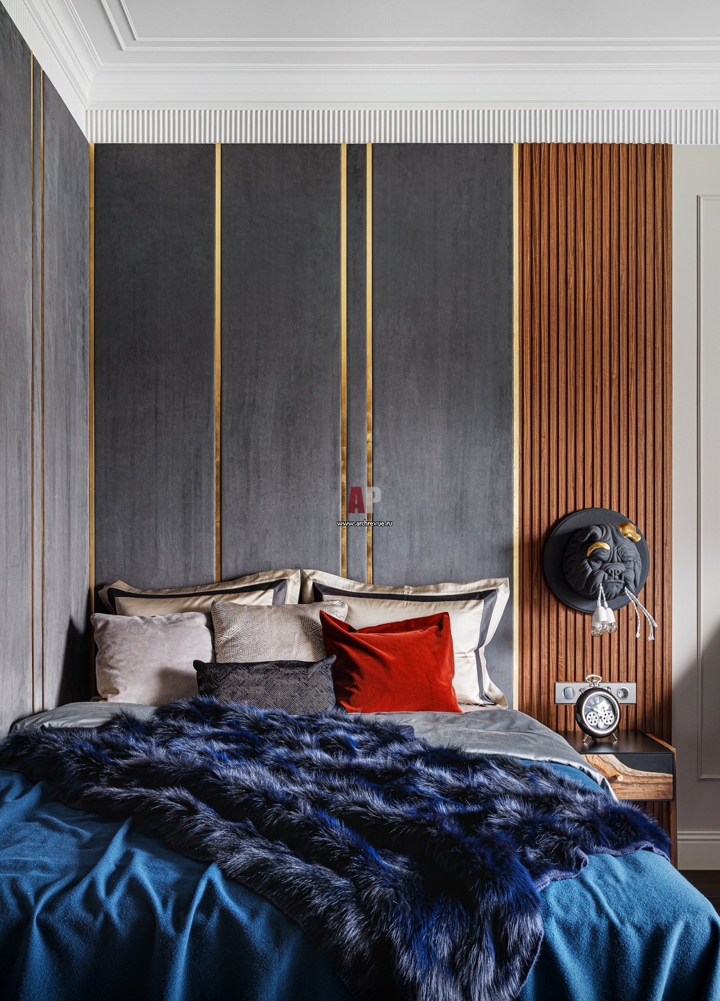 Спальня сына. Кровать, стеновые панели из дерева и замши с латунными вставками изготовлены по эскизам дизайнера. Бра-бульдог Karman расписано специально для этого проекта.