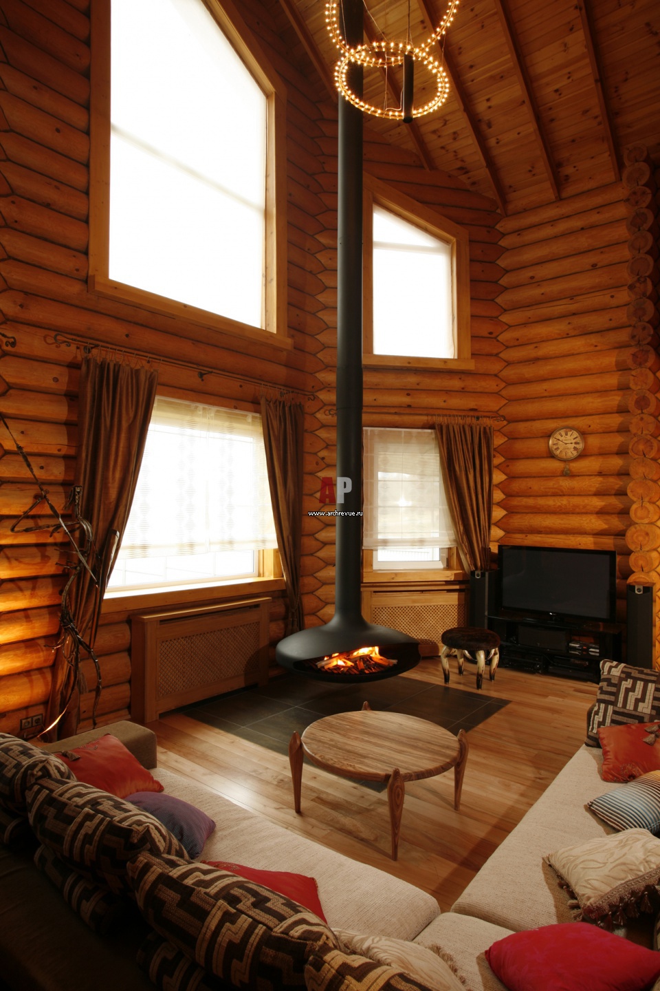 Высоту двухсветного пространства гостиной подчеркивает камин Focus, поставщик «Интерьерный салон» («Арт-тон камины»). А также большой угловой диван Roche Bobois.