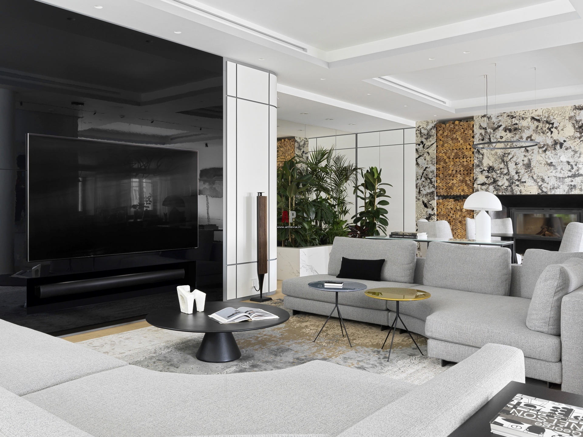 Стены в гостиной зашиты геометрическими панелями из окрашенного МДФ с серым рустом. Работы по дереву – компания, «АФ Ника».