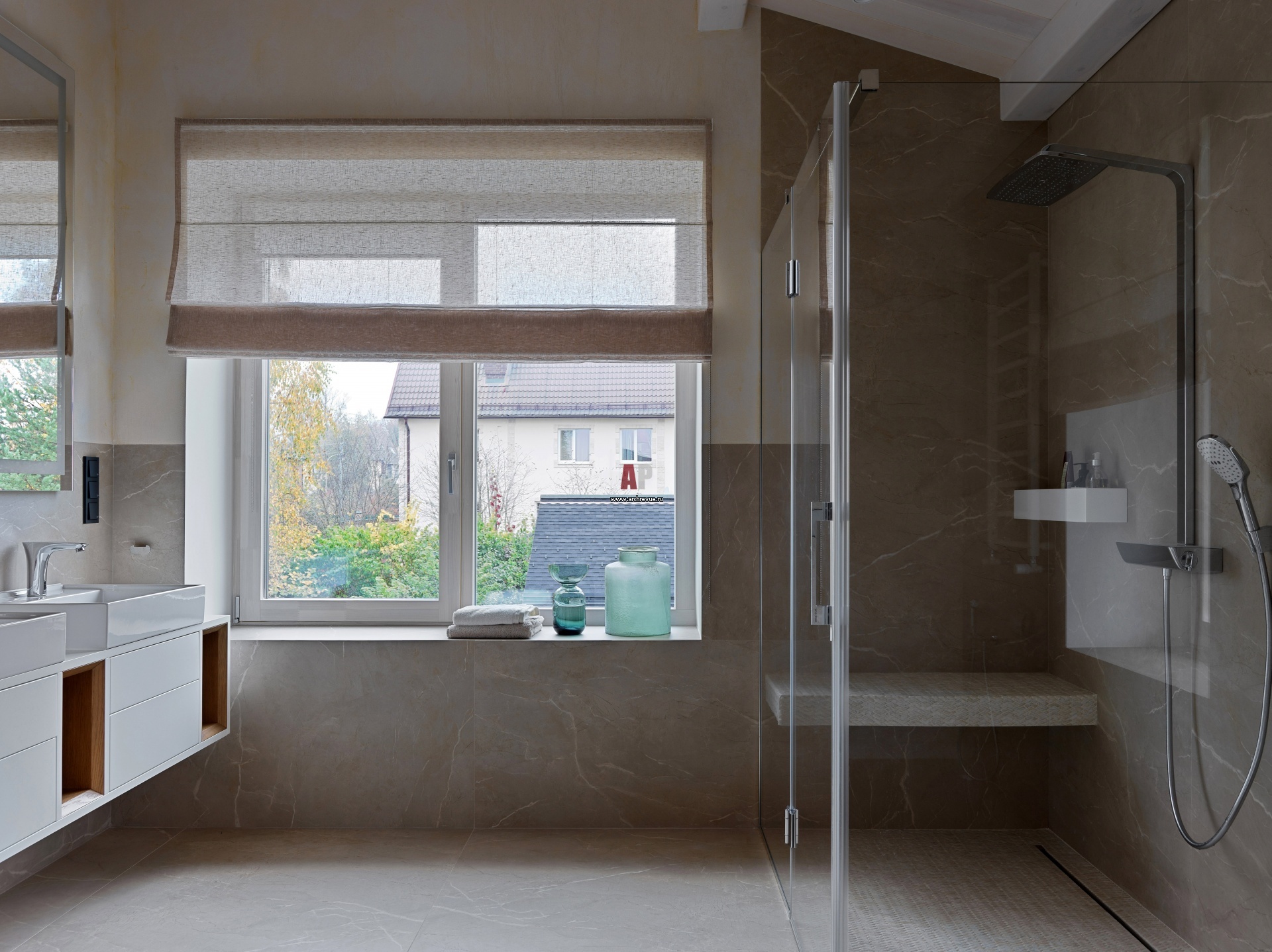 Интерьер основного санузла построен на контрасте разных фактур: крупноформатного керамогранита, каменной мозаики, декоративной штукатурке и дереве.