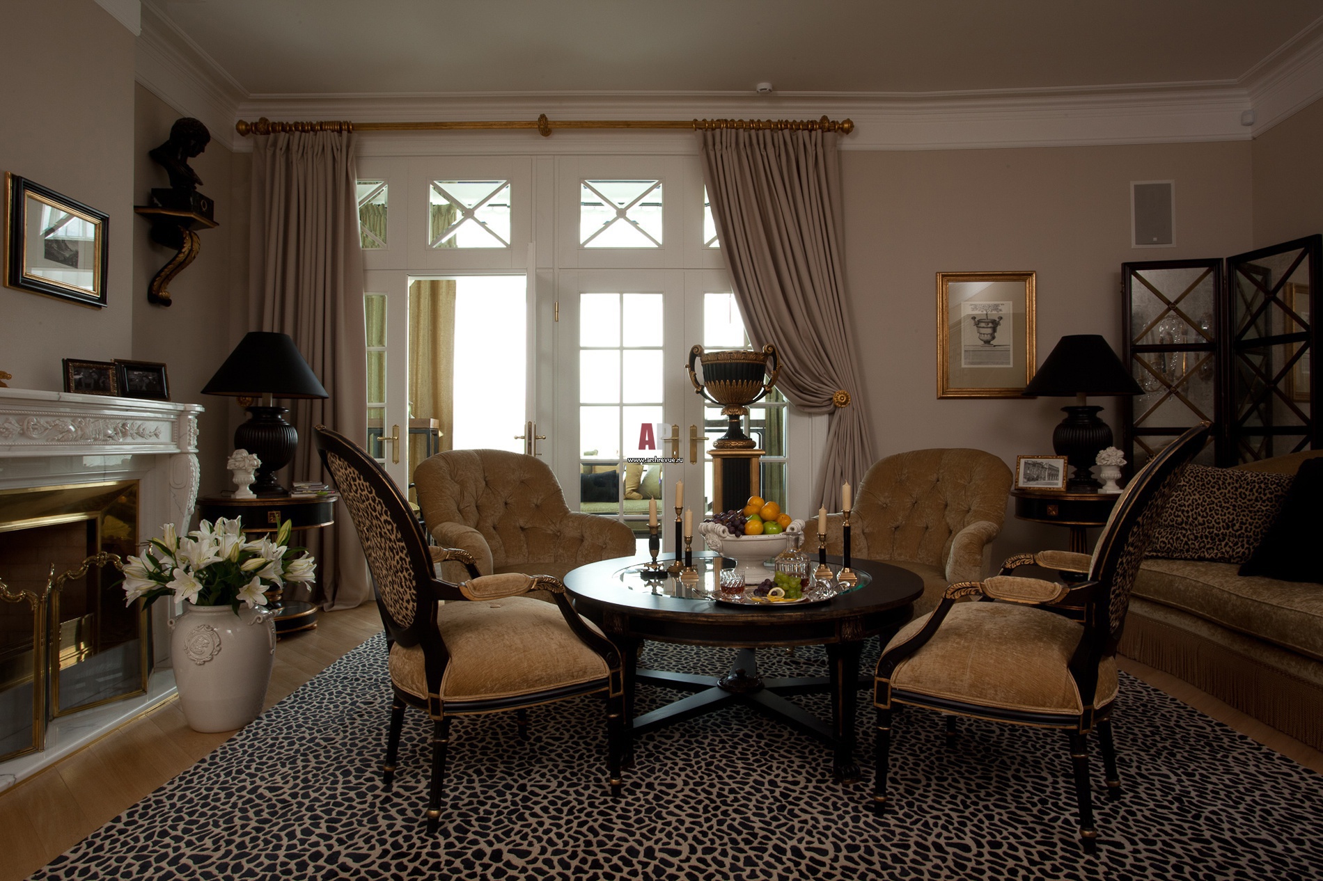 Приватная гостиная с камином. Анималистичный ковер Bomat – примета традиционного американского интерьера.
