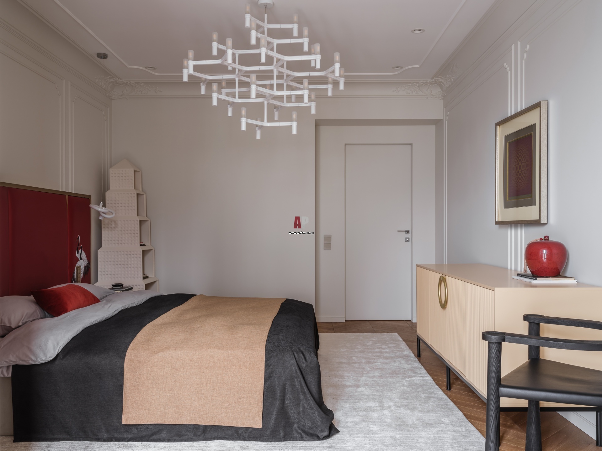 Хозяйская спальня. Подвесной светильник, Nemo. Ширма-изголовье кровати с ручной росписью на шелке, на заказ.