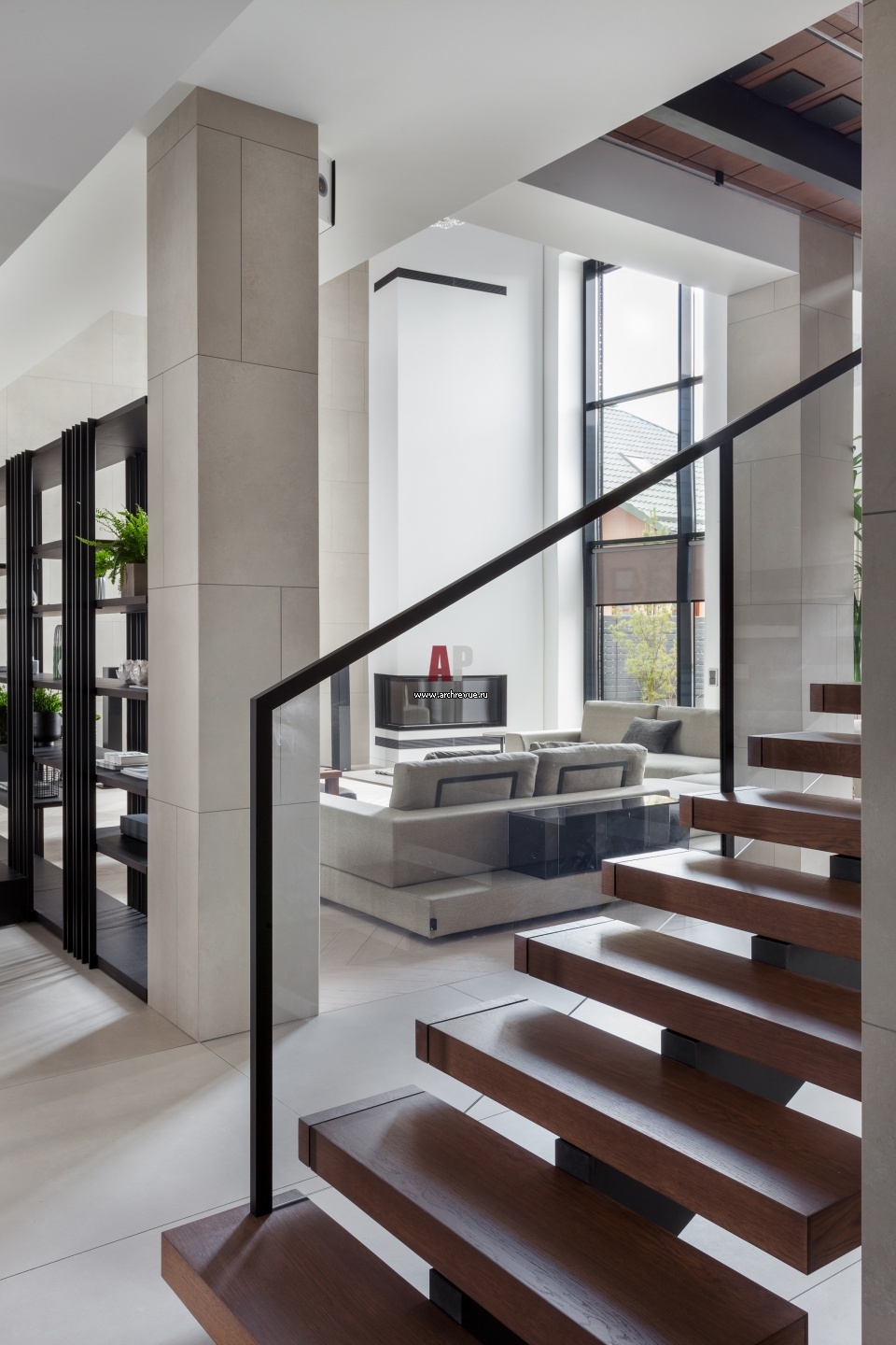 Ограждение лестницы изготовлено из обесцвеченного стекла, обрамленного тонким деревянным профилем, отчего кажется, что поручень парит над маршем.