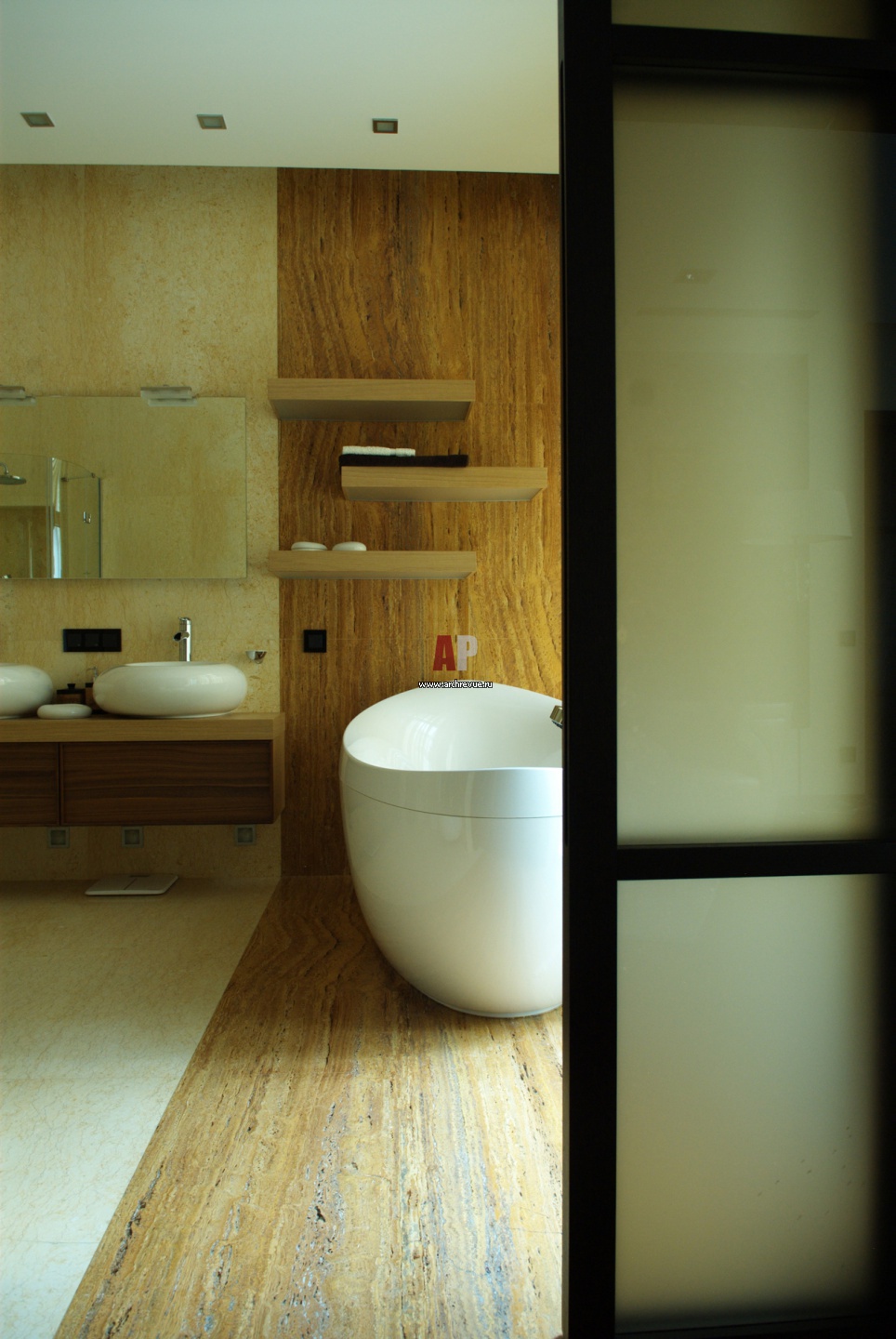Хозяйский санузел отделен от спальни раздвижными дверями с матовым стеклом, изготовление «Александр Ней». Он исполнен в мраморе песочного цвета.