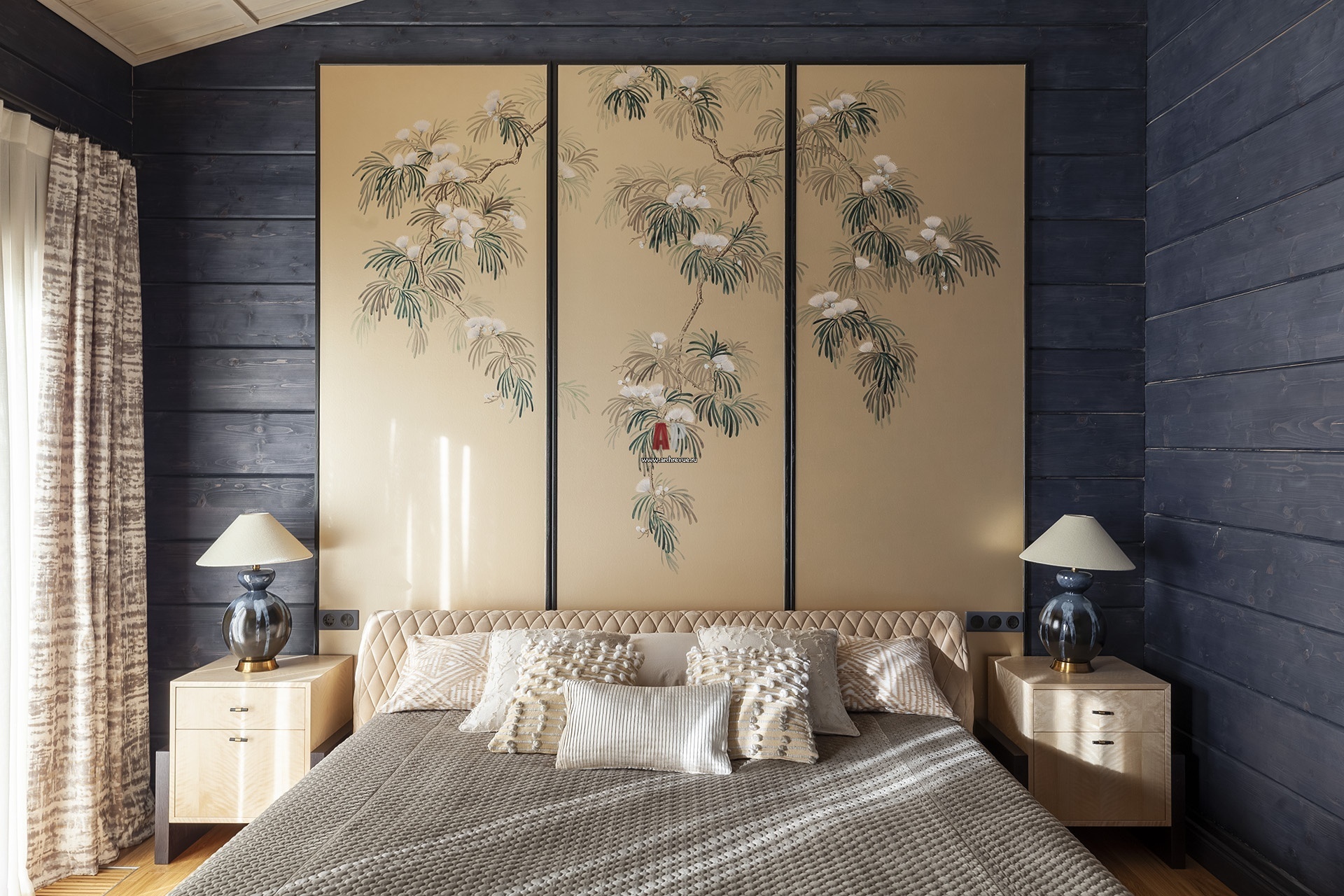 Стены в спальне выкрашены в темный синий цвет. За изголовьем кровати – панно из обоев De Gournay с ручной росписью с изображением цветущей акации. Кровать, Estetica. Прикроватные тумбы сделаны на заказ из древесины пламенной березы. Лампы, винтаж.