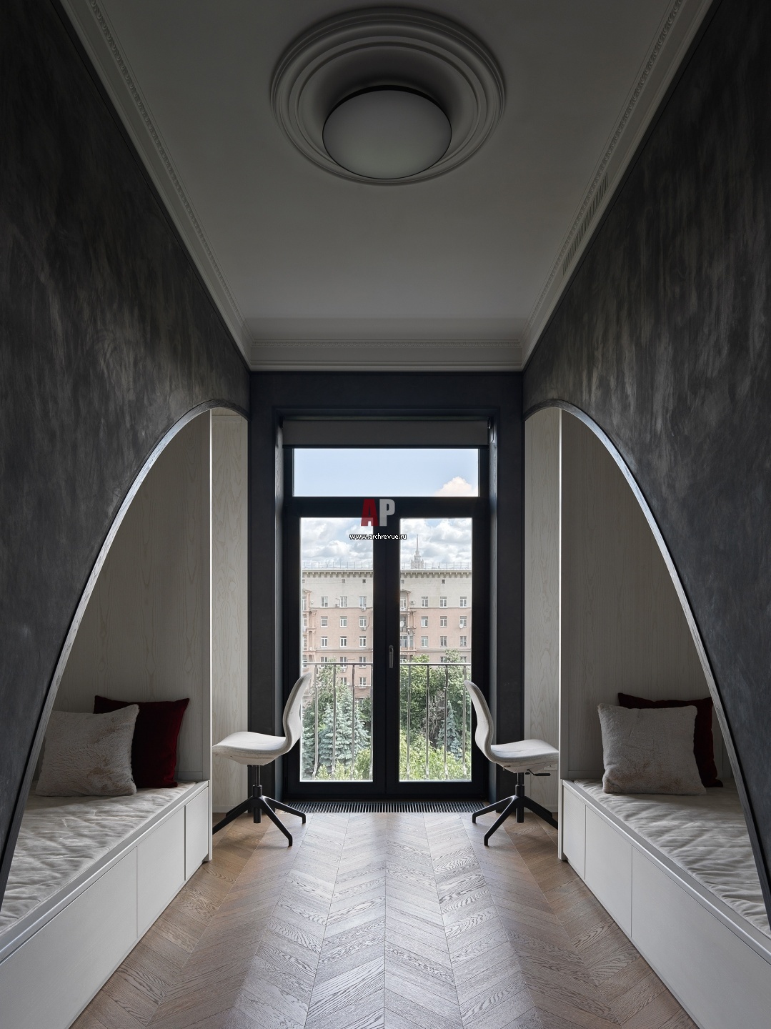 Комната для двоих сыновей-школьников. Помещение зонировано с помощью перегородок-крыльев из натуральной замши. В широкой части каждого крыла есть дверь в личную гардеробную. У окна размещены рабочие группы.