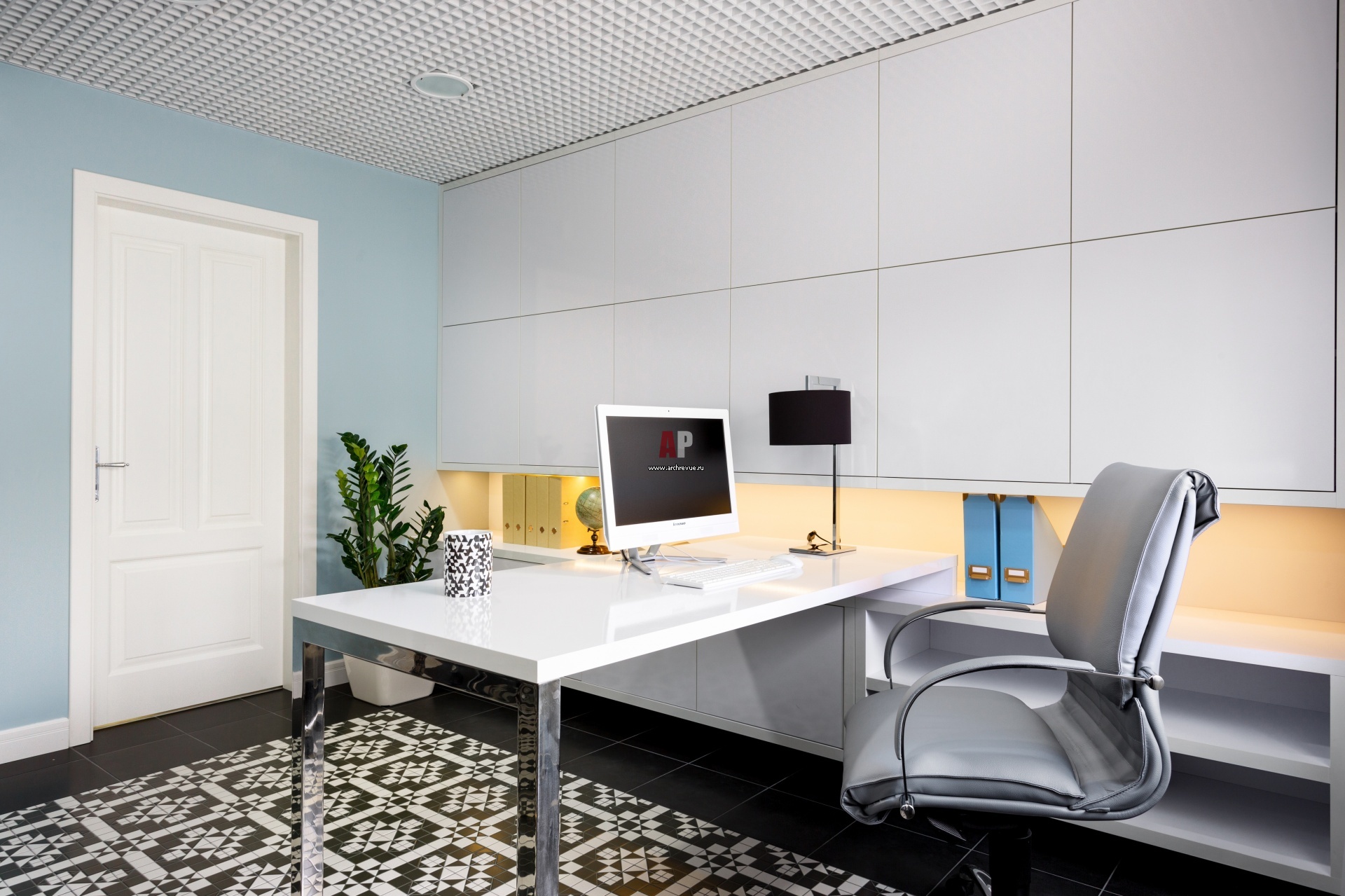 Кабинет сотрудников юридического бюро. Важная деталь интерьера – встроенные шкафы для хранения документооборота. Чтобы встроенные шкафы не смотрелись громоздко, на уровне письменного стола сделана открытая полка с подсветкой.