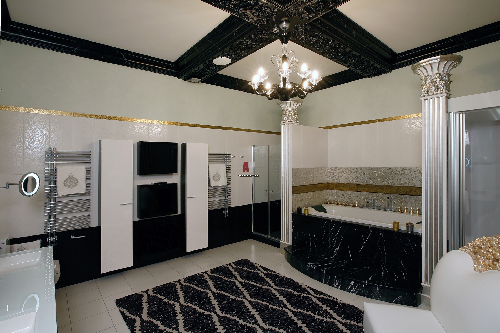 Хозяйский санузел в черно-белой цветовой гамме. Ванна облицована слэбом черного мрамора. Потолки украшены черными лепными карнизами.