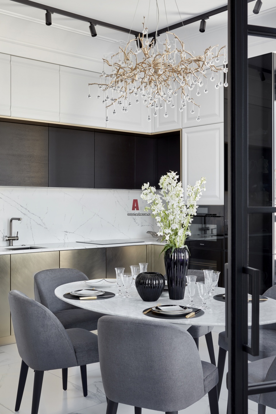 Фасады кухни выполнены в трех материалах: верхние шкафы – из филенчатого дерева с белой эмалью, нижние – латунные листы, центральный пояс – темное дерево.