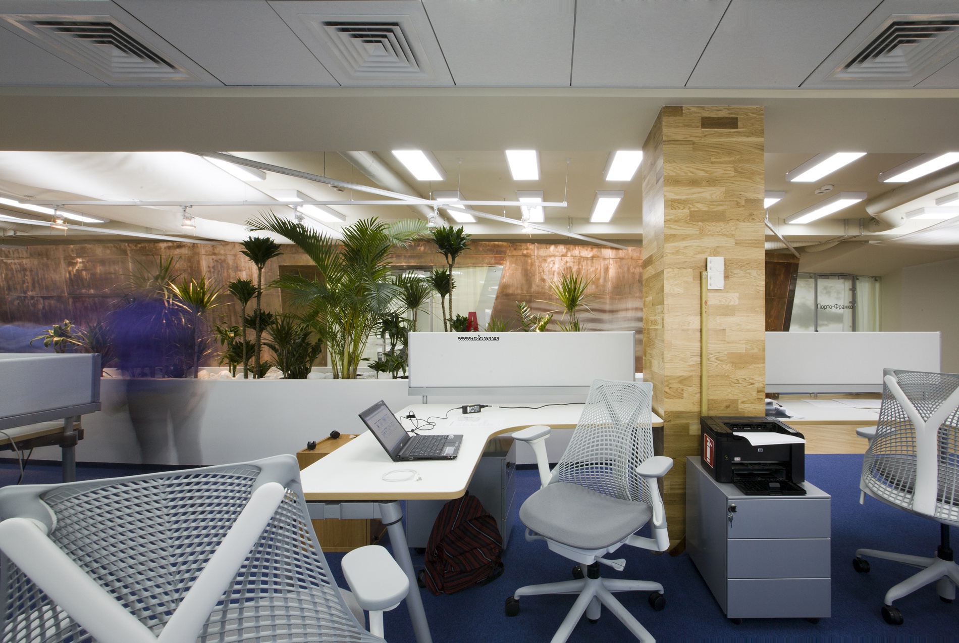 Рабочая зона организована как open-space. Авторы проекта Петр Зайцев, Арсений Борисенко, архитектурное бюро za bor. На потолках – акустические панели Ecophon со звукопоглощающим эффектом.