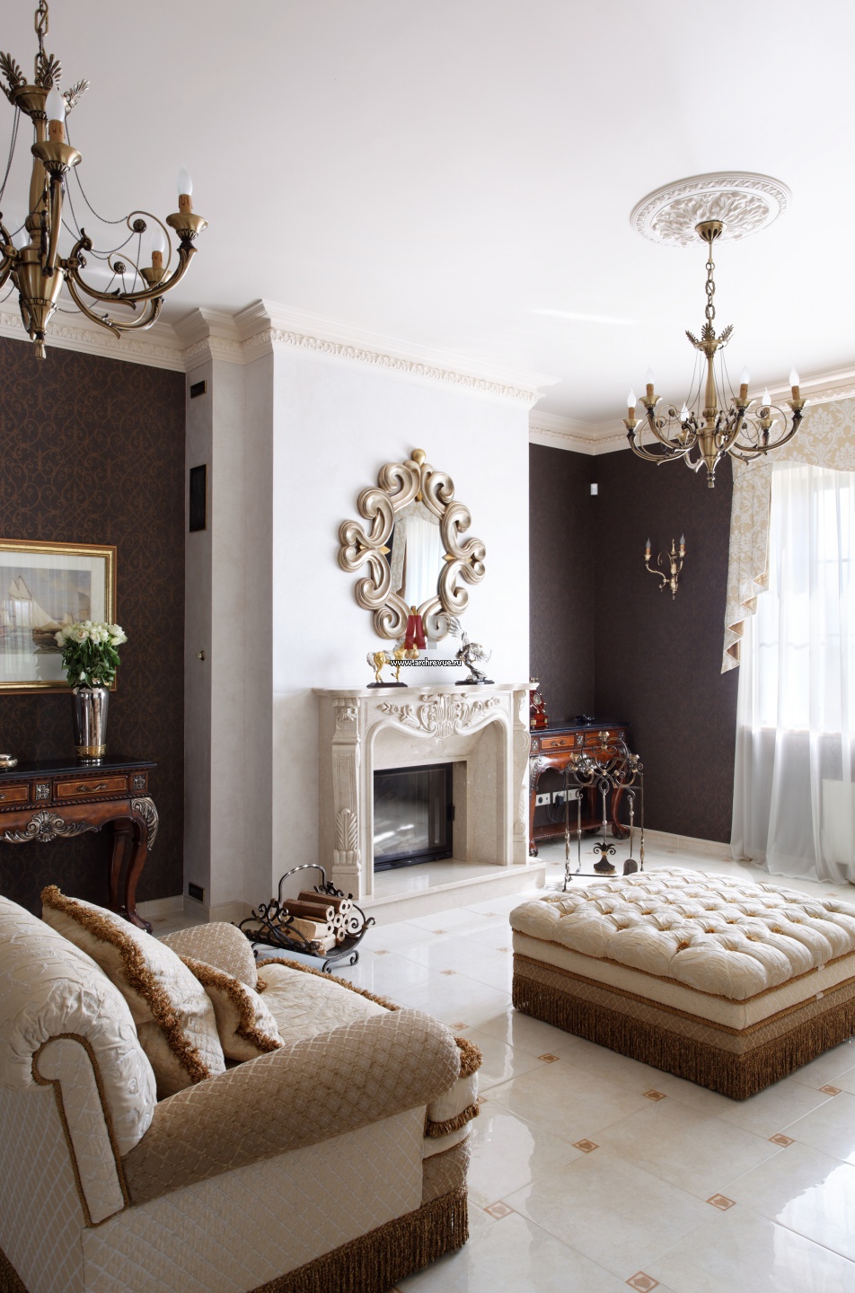 Камин выполнен в духе французской классики. Благодаря особой форме корпуса (при которой топка слега заглублена в стену), он выглядит легко. Портал выполнен из резного светлого камня, композиция дополнена черными коваными аксессуарами.