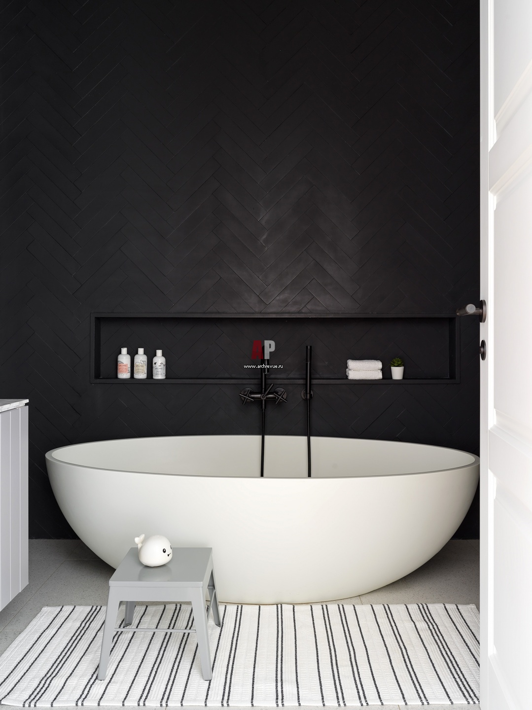 Интерьер ванной комнаты. Черная керамика не стене имитирует паркетную укладку.