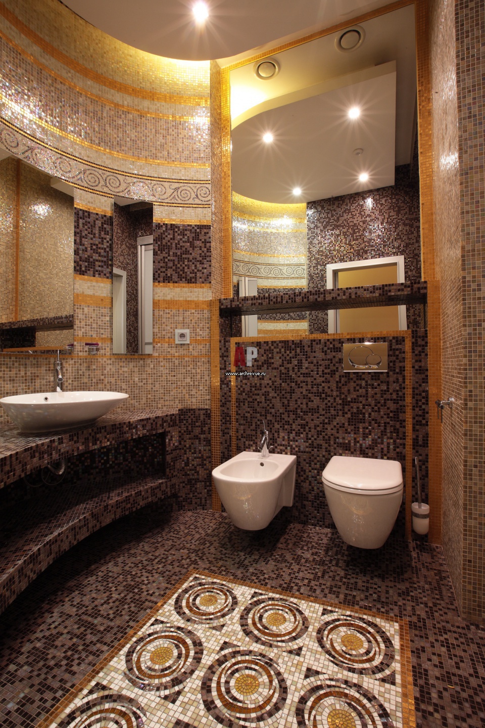 Гостевой санузел с полукруглой стеной отделан мозаикой Sicis. Н полу – эффектное мозаичное панно.